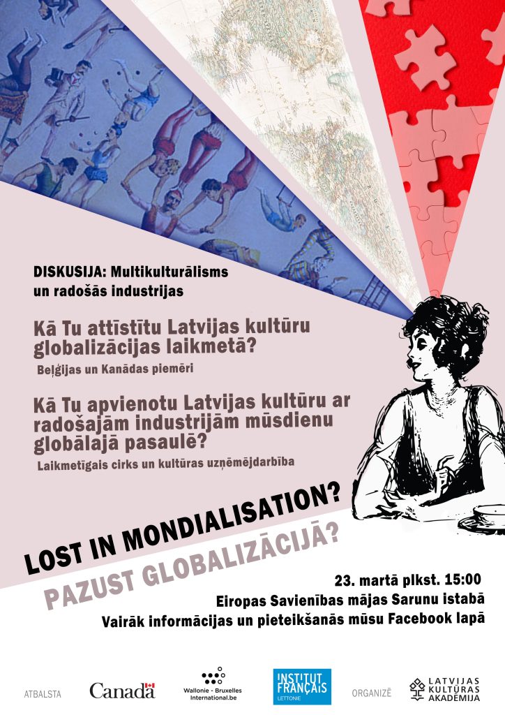 23. martā no plkst. 15:00 līdz 17.00 Eiropas Savienības mājas Sarunu istabā (Aspazijas bulvārī 28) Latvijas Kultūras akadēmija (LKA) aicina uz diskusiju jauniešiem „Pazust globalizācijā? / Lost in mondialisation?”. Diskusija tiks veltīta nacionālās kultūras, tai skaitā radošo industriju, vietai globalizācijas apstākļos. Iecerēts, ka pēc diskusijas tiks radīti priekšlikumi nacionālās identitātes attīstīšanai globalizācijas laikmetā.
