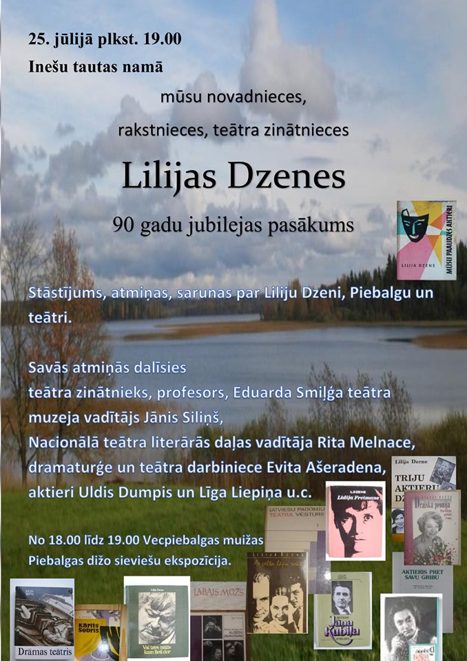 25.jūlijā plkst. 19.00 Inešu tautas namā notiks novadnieces, rakstnieces, teātra zinātnieces Lilijas Dzenes 90 gadu jubilejas pasākums – stāstījums, atmiņas, sarunas par Liliju Dzeni, Piebalgu un teātri.