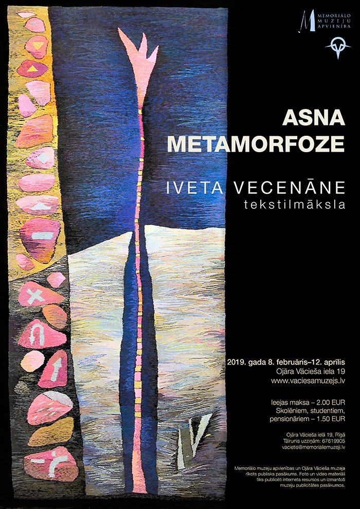 8. februārī Ojāra Vācieša muzejā (O. Vācieša ielā 19, Rīgā) tiks atklāta tekstilmākslinieces Ivetas Vecenānes izstāde “Asna metamorfoze”.