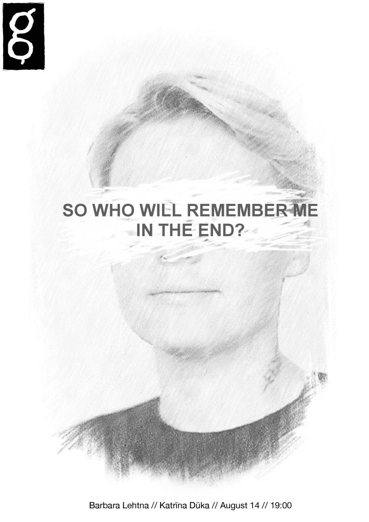 Igauņu māksliniece Barbara Lehtna piektdien, 14. augustā, plkst. 19.00 aicina uz savas rezidences prezentāciju “So Who Will Remember Me In The End?”. Pasākums ir bez maksas, bet ierobežotā skatītāju skaita dēļ iepriekš jāpiesakās, rakstot epastu uz kase@git.lv.
