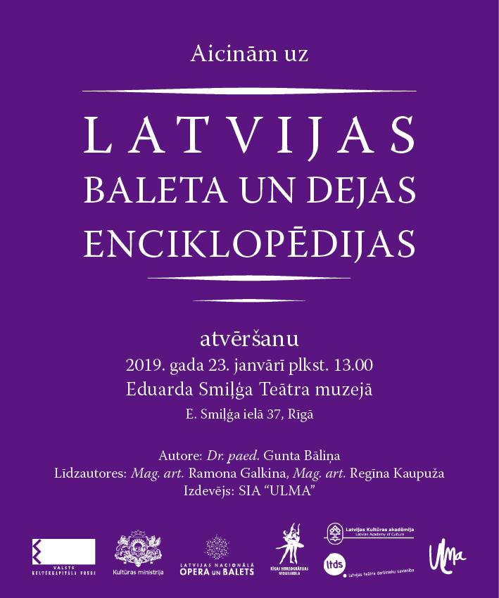 23. janvārī plkst. 13.00 Eduarda Smiļģa Teātra muzejā notiks izdevniecībā “ULMA” iznākušās Latvijas Baleta un dejas enciklopēdijas atvēršanas svētki. Atzīmējot Latvijas simtgadi, tapis vērienīgs izdevums, kas aptver informāciju par Latvijas pašreizējo daudzveidīgo dejas saimi tās krāšņumā un dažādībā.