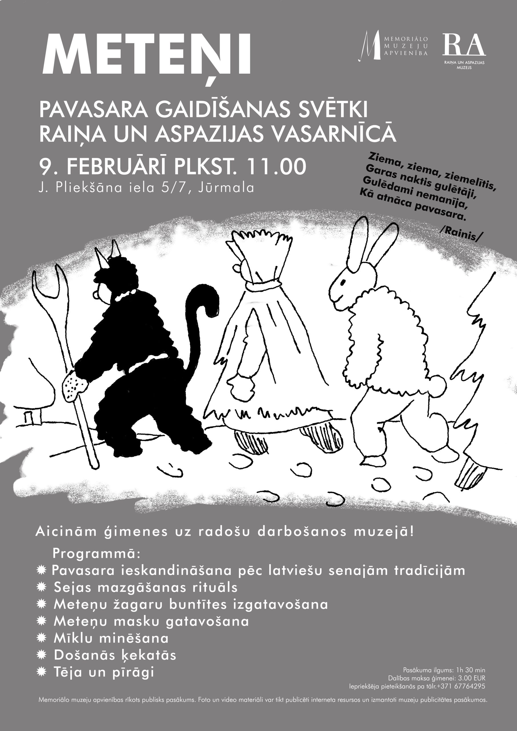 Meteņu pasākumā Raiņa un Aspazijas vasarnīcā bērni kopā ar vecākiem varēs izgatavot Meteņu buntītes un maskas, veikt sejas mazgāšanas rituālu, minēt mīklas, kā arī doties jautrās rotaļās un ķekatās un cienāties ar tēju un pīrāgiem.