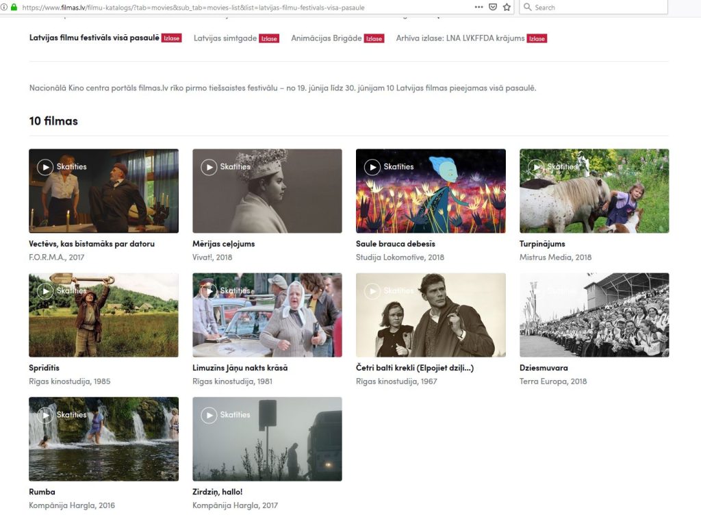 Nacionālā Kino centra portāla filmas.lv rīkotais pirmais tiešsaistes festivāls “Latvijas filmas pasaulē”, kura ietvaros 10 Latvijas filmas bija pieejamas noskatīšanai jebkur pasaulē, izpelnījies lielu ievērību – desmit dienu laikā portālu apmeklējuši vairāk nekā 30 000 interesenti, apskatot vairāk nekā 125 000 lapas portālā, un kopējais filmu skatīšanās laiks sasniedzis 242 dienas.