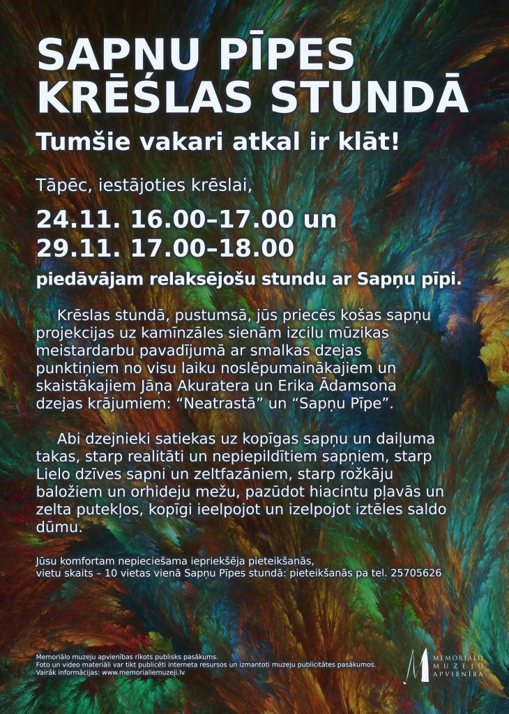 Akuratera muzejs (Ojāra Vācieša iela 6a, Rīga) aicina: 24. novembrī no plkst. 16.00 līdz plkst. 17.00 un 29. novembrī no plkst. 17.00 līdz plkst. 18.00 pavadīt relaksējošu stundu nama kamīnzālē kopā ar “Sapņu pīpi”.