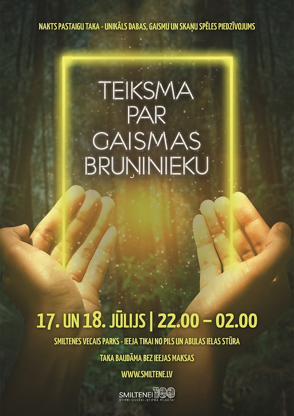 2020. gada 17. un 18. jūlijā no plkst. 22.00 līdz 02.00 Smiltenes pilsētas Vecajā parkā ikvienam būs iespēja vērot īpaši Smiltenes 100 gadu jubilejai veidotu, unikālu nakts pastaigu taku ar skaņas, gaismas un video instalācijām “Teiksma par gaismas bruņinieku”. Šis būs mākslas darbs, kurā apvienosies gaismu māksla, proza, dramaturģija, mūzika, aktiermāksla, scenogrāfija, video un skaņu režija, kuru paredzēts baudīt esot kustībā, ejot cauri Vecajam parkam virzienā no Vidusezera slūžām uz Tepera ezera pārgāzni. Parka teritorijā būs izvietoti kopumā 12 monumentāli gaismas un video objekti.