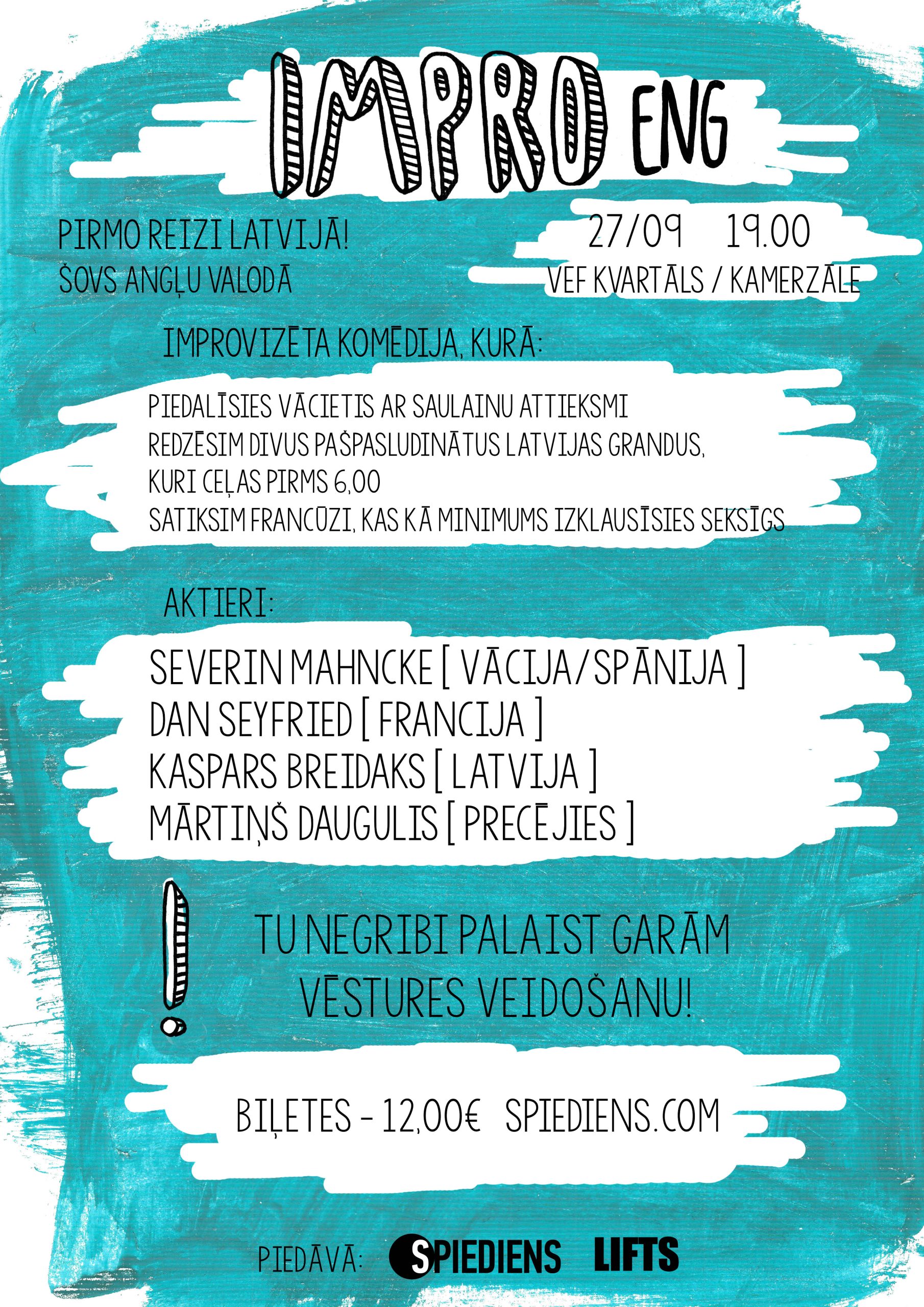27. septembrī plkst. 19:00 VEF Kvartāla Kamerzālē skatītājiem divās smieklu piepildītās stundās būs iespēja satikties ar Francijas, Vācijas un Latvijas improvizatoriem. Izrāde notiks angļu valodā, tāpēc būs īpašs izaicinājums improvizatoriem un nebijis baudījums skatītājiem.