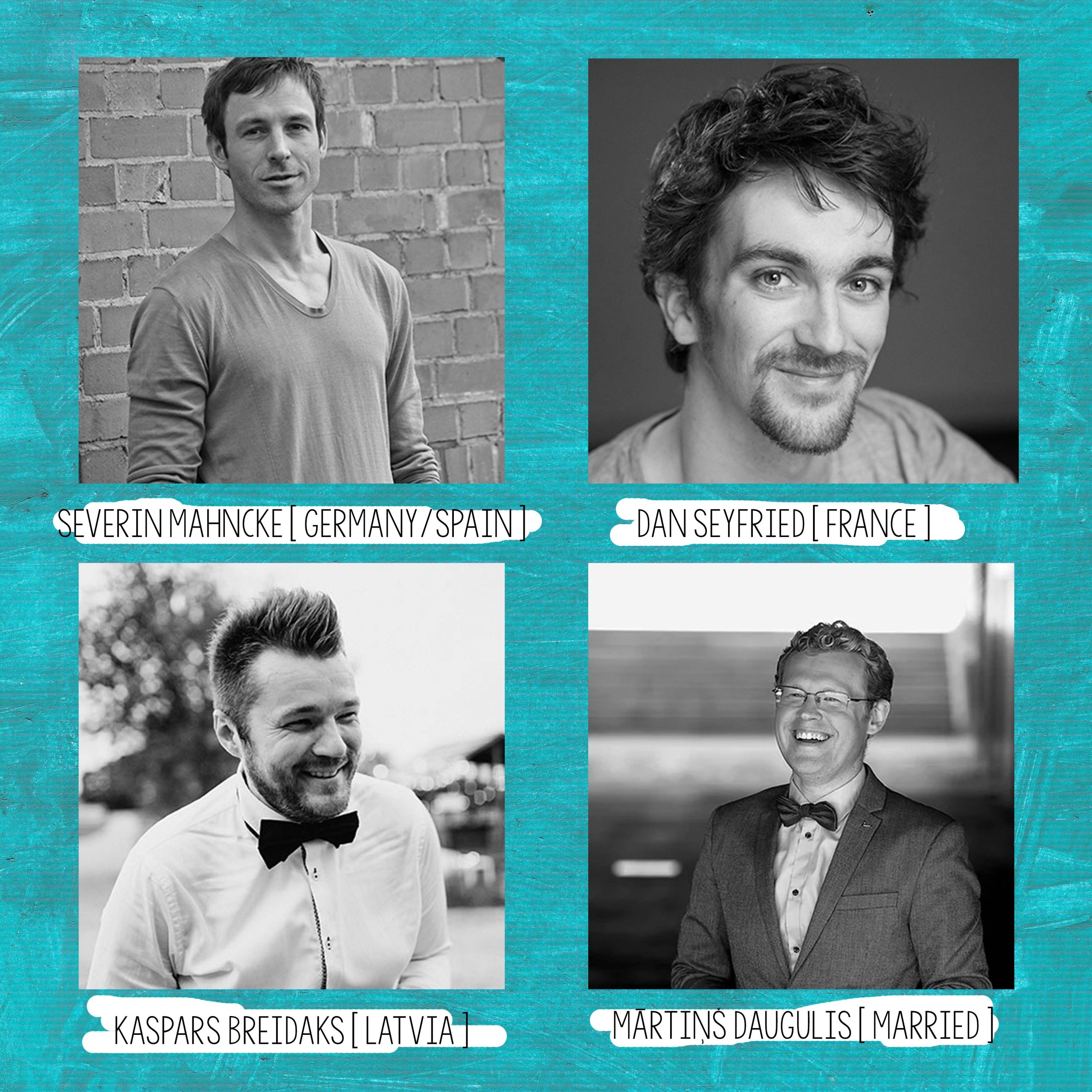 Kolorītā ansambļa sastāvā Severīns Manke (Severin Mahncke), vācietis ar saulainu attieksmi, kurš pēdējos divus gadus priecē skatītājus Barselonā. Savas karjeras laikā piedzīvojis gana daudz spilgtu brīžu arī uz Amerikas skatuvēm. Divi pašpasludināti Latvijas grandi, kuri mostas pirms 6:00 un vada rīta programmas TV un Radio – Mārtiņš Daugulis no LNT brokastīm un Kaspars Breidaks – Radio SWH rīta šovs “Tik Tik Tik”.  Īpaši dāmām, kungs no Francijas – Dens Seifrīds (Dans Seyfrieds), kuram bijis tas gods strādāt ar vienu no pasaules improvizācijas teātra pamatlicējiem Kītu Džonstonu (Keith Johnstone).