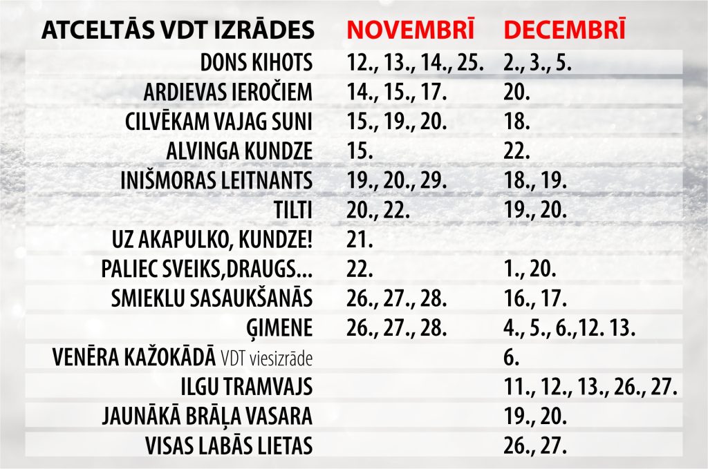 Cerot uz iespēju skatītājus aicināt uz izrādēm pavasarī, TIEK ATCELTAS no 9. novembra nenotikušās izrādes, kā arī viesizrāde Ogrē. Visiem biļešu īpašniekiem tiks atmaksāta nauda.