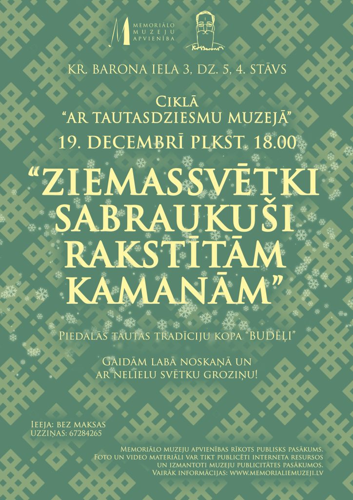 Kr. Barona muzejā 19. decembrī plkst. 18.00, sagaidot Ziemassvētkus, uzzināsit vēl daudz interesantu tradīciju, sadziedājot kopā ar tautas tradīciju kopu Budēļi!