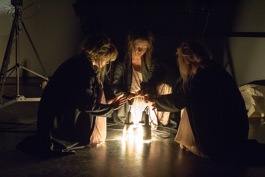 Pirms ieejas Valmieras teātra LMT zālē jau ir dzirdama vētras skaņa – gaudojošs vējš, kas pareģo robežsituāciju un rada apdraudētības sajūtu, jo nav skaidrs, kas sagaida, bet var nojaust, ka gaidāmais nebūs romantizēti priekšstati par un ap Aspazijas laika sievietes mīlestības rašanos, attīstību un galu. Iestudējuma telpa ir tukša skatuve, kuru iekļauj gaismas prožektori un ventilatori, iezīmējot spēles laukumu taisnstūra formā. Izrādes sākumā, skatītājiem ienākot, aktrises guļ uz skatuves, ievīstītas čaukstošās papīra loksnēs, skatam atsedzot tikai viņu matus un sejas fragmentus. Iestudējuma laikā telpas mainīgumu nosaka atšķirīgās mizanscēnas – te aktrises atrodas vienkopus skatuves priekšplānā, te katra savā skatuves stūrī. Aktrišu kustībai spēles laukumā nereti trūkst iekšējās motivācijas, kas ļautu skatītājam to uztvert ne tikai formas paņēmienu, bet atrast arī dziļāku saturu. Izrādes sākumā aktrises atrodas guļus stāvoklī, raisot asociācijas ar kūniņām, kuras, no vienas puses, ir patvērums, no otras – tikai pagaidu mītne. Telpa, kurā risinās izrādes darbība, var būt jebkur un jebkad, cilvēki tajā, šķiet, parādījušies pirmo reizi, un tāpēc sākumā telpa un cilvēks it kā izslēdz viens otru. Situācijas sakāpināto atmosfēru paaugstina ap aktrisēm esošie ventilatori un prožektori, no kuriem tiek pūsta strauja gaisa un gaismas plūsma. Cilvēka/sievietes ķermenis atrodas nekurienes vidū, kurā iekļauties iespējams, savstarpēji pielāgojoties vai pārtopot gan fiziskā, gan garīgā līmenī. Reiņa Suhanova telpas koncepcija ļauj domāt par pirmatnējā cilvēka atrašanos pasaules radīšanas situācijā, bet diemžēl neatklājas ne Aspazijai aktuālie dzejas tēli, ne skaidrs režisora piedāvājums to interpretācijai.