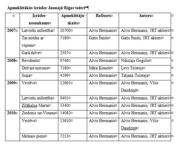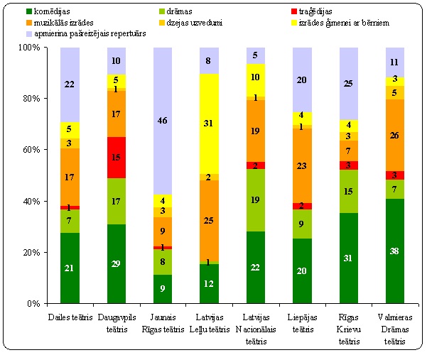 Aplūkojot Latvijas Nacionālā un Dailes teātra apmeklētākās izrādes[40], jāsecina, ka publika visvairāk apmeklē izklaidējoša rakstura izrādes; no 20 visapmeklētākajām izrādēm konkrētajos teātros 10 ir komēdijas: Cits Šerloks Holmss, Lodes pār Brodveju, Manu sievu sauc Moriss, Ja mana sieva uzzinās…, Gaisa grābekļi, Draudzes bazārs, Pusdūša. Mundis, Teātra žurka 2009 jeb Kornēlijas atgriešanās, Latgola.lv un 100 g žurkas. Apmeklētāko izrāžu tabulā ietilpst septiņas muzikālas izrādes vai mūzikli: Cits Šerloks Holmss, Drakula. Svešās asinis, Adata, Princis un ubaga zēns, Kerija. Retrospekcija, Vadonis un Leo. Pēdējā bohēma, kas padara muzikālās izrādes par otru apmeklētāko izrāžu kategoriju. Starp apmeklētākajām izrādēm jāmin divas starpžanra izrādes — Lolita un Īstvikas raganas, viena drāma — Pērs Gints nav mājās un viena bērnu izrāde — Punktiņa un Antons. Dailes teātra apmeklētākās izrādes atklāj, ka šajā teātrī apmeklējuma ziņā vadošais režisors ir Dž. Dž. Džilindžers; citu režisoru izrāžu panākumi varētu būt dažādu veiksmes faktoru sakritības: attiecīgi Cits Šerloks Holmss, visticamāk, piesaistījis nevis kā Andra Bērziņa režijas darbs, bet gan kā 1979. gadā tapušās Šerloka Holmsa izrādes atkārtots uzvedums, kurā publikai atkārtoti tika dota iespēja klausīties par klasiku kļuvušajās Raimonda Paula dziesmās, tāpat arī Mihaila Gruzdova iestudētā izrāde Pērs Gints nav mājās piesaistīja kā Māras Zālītes jaunākais dramaturģiskais sacerējums, tā arī H. Ibsena poētiskās drāmas Pērs Gints popularitāte Latvijā, pateicoties Ā. Elksnes dzejai, Ā. Šapiro izrādei un t.s. lielo ziemeļnieku literatūras mīlestībai latviešu vidū. Izrāde Manu sievu sauc Moriss piesaistīja skatītāju ar veiksmīgi izveidoto mārketingu un faktu, ka visas lomas (gan sieviešu, gan vīriešu) tēlo vīrieši, publikas iemīļoti aktieri. Izrāde Gaisa grābekļi skatītāju uzmanību visticamāk piesaistījusi ar savu aktuālo tematiku. Latvijas Nacionālajā teātrī saskatāma līdzīga situācija — arī šeit ir viens vadošais režisors kases ienākumu ziņā. Latvijas Nacionālā teātra publika pamatā izvēlas apmeklēt Edmunda Freiberga veidotās izrādes, un šī tendence ilgst jau vairākus gadus[41]. Šeit vērojams arī būtisks populāru muzikālo izrāžu īpatsvars (Adata, Princis un ubaga zēns, Kerija. Retrospekcija, Vadonis, Leo. Pēdējā bohēma). Latvijas Nacionālā teātra literārā padomniece Ieva Struka par izrādes Adata veiksmes iemesliem nosauc izrādes tēmu (narkotisko vielu atkarības problēma), un to, ka izrāde veidota pēc autobiogrāfiska darba motīviem — teātris šo faktu arī veiksmīgi izmantojis izrādes mārketinga veidošanā.[42] Gaļinas Poliščukas režisētās izrādes Kerija. Retrospekcija panākumi visticamāk saistīti ar labu muzikālo aktieru piesaisti izrādei, kā arī fakts, ka izrādē klātienē piedalījās Raimonds Pauls[43], kas varētu būt galvenais šīs izrādes veiksmes iemesls. Aplūkojot tabulu, saskatāma arī interesanta tendence — Latvijas Nacionālajā teātrī vienlīdz aktīvi tiek apmeklētas gan muzikālas izrādes, gan komēdijas, bet Dailes teātrī — komēdijas. Jaunais Rīgas teātris Latvijas teātra vidē jau iemantojis radošā līdera godu; jau pieminētajā 2008. gada pētījumā tiek teikts, ka šim teātrim ir izveidojusies pilnīgi cita auditorija[44], kas gan ir diskutabls apgalvojums, jo katram teātrim gadu gaitā izveidojusies sava publika, noteiktai sabiedrības daļai līdztekus apmeklējot visus teātrus, tomēr jāatzīst, ka Jaunais Rīgas teātris ar saviem panākumiem ārzemēs pievilina pašmāju skatītājus un ir kļuvis par sava veida fenomenu Latvijas teātra vidē. Apskatot šī teātra skatītākās izrādes[45], kļūst skaidrs, ka teātra apmeklējuma augstie rādītāji saistīti ar režisoru Alvi Hermani, kurš tiek uzskatīts par Latvijas teātra neoficiālu līderi[46]Latviešu mīlestība, Garā dzīve, Revidents, Soņa, Vectēvs, Zilākalna Marta, Ziedonis un Visums un Melnais piens). Jauno Rīgas teātri raksturo arī konsekventa repertuāra politika, kas izveidojusies vadoties pēc A. Hermaņa izrādes Latviešu stāsti panākumiem; teātra kritiķe V. Čakare atzīmējusi, ka šajā izrādē A. Hermanis radījis priekšstatu par latviešu sabiedrību kā atsevišķu indivīdu kopumu, kurā „vēsture atklājas nevis kā vienots vēstījums, bet kā daudzu savstarpēji pretrunīgu vēsturu tīklojums”[47]. A. Hermanis kopā ar Jaunā Rīgas teātra aktieriem turpinājis darbu pie tā sauktās stāstu stāstīšanas tādos savos darbos kā: Latviešu mīlestība, Garā dzīve, Klusuma skaņas u. c. Interesanti ir arī tas, ka tieši Jaunā Rīgas teātra publika ir visapmierinātākā ar teātra piedāvāto repertuāru (tas apmierina 46 % apmeklētāju)[48], tomēr arī šī teātra publika vislabprātāk Jaunā Rīgas teātra repertuāra piedāvājumā redzētu vairāk komēdiju[49]. Starp skatītākajām izrādēm atrodamas trīs izrādes, kuras varētu nosaukt par komēdijām (Latviešu mīlestība, Tas notika ar viņiem, Revidents), Dzīvais mironis Māras Ķimeles režijā turpretī vairāk pretendē uz drāmas nosaukumu; pārējās izrādes ietilpst jau pieminēto stāstu kategorijā. Rezumējot — arī Jaunā Rīgas teātra skatītākās izrādes parāda viena, izteikta līdera (Alvja Hermaņa) lomu teātra apmeklējuma veidošanā. Aplūkojot situāciju trīs apmeklētākajos Latvijas teātros, jāsecina, ka Latvijas teātra vidē var runāt par trīs teātru (Dailes teātris, Jaunais Rīgas teātris, Latvijas Nacionālais teātris) piederību pamatplūsmai; šeit gan jāņem vērā fakts, ka apmeklētākās izrādes lielākoties uzvestas teātru lielajās