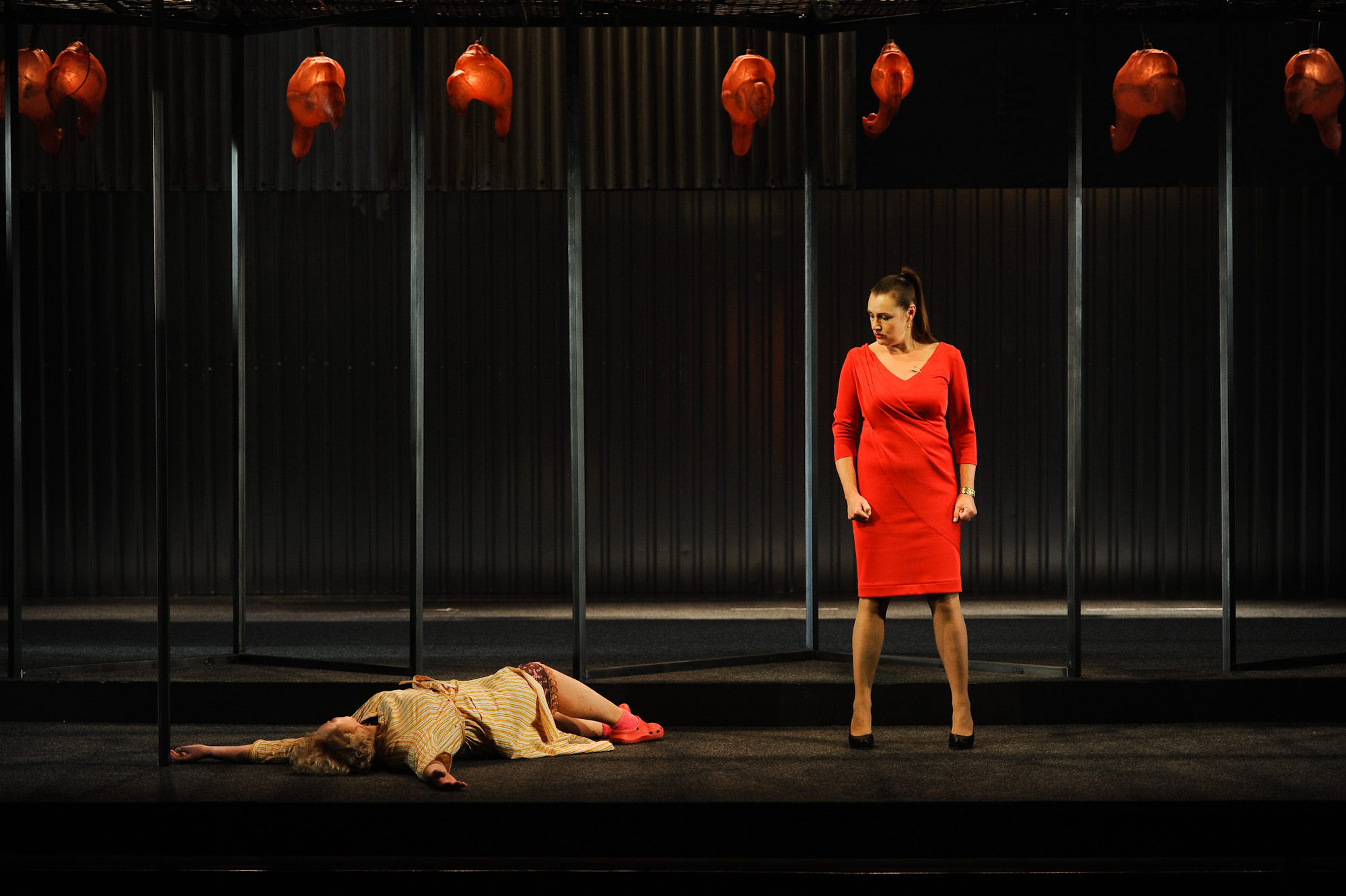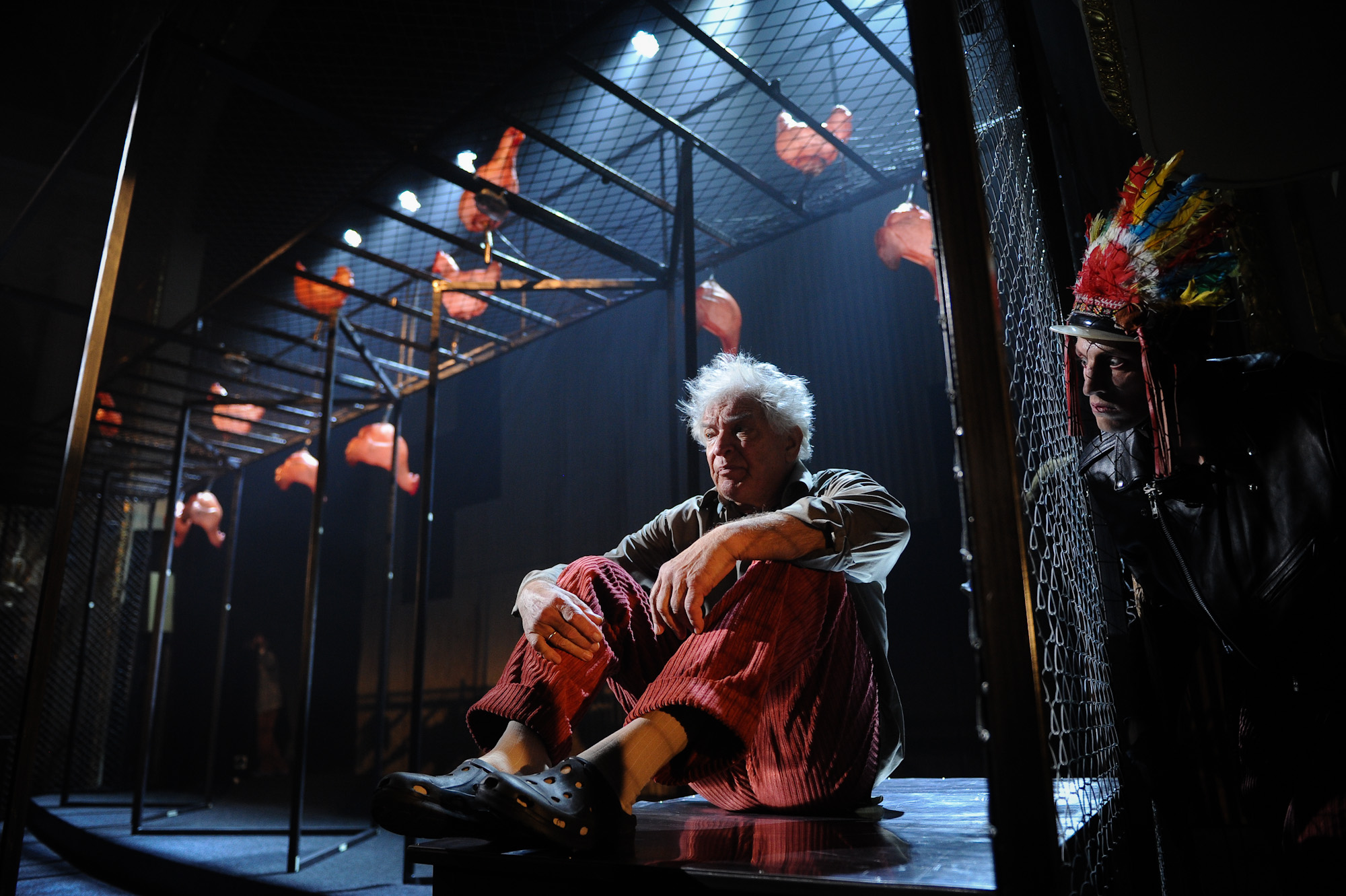 Abi slāņi izrādē nodalīti gan estētiski, gan skatuves laika ziņā. Reiņa Suhanova telpa atgādina noliktavas un būra krustojumu, tajā iesprostotie varoņi lielāko iestudējuma daļu cenšas tikt galā ar kopīgās eksistences absurdu un līdzcilvēkiem, ko izjūt kā nastu, reālpsiholoģiski. Brīnišķīgi spēlē Ģirts Jakovļevs (Bruno), Uldis Anže (Jāzepa dēls Andris) un Jurģis Spulenieks (Mikus) – viņiem izdodas atklāt sarežģītus, bet cilvēciski saprotamus likteņus. Līdzīgu stratēģiju izmanto Astrīda Kairiša, lai gan viņas Silvijai izrādē ir tik maz vietas, ka neko daudz par viņas varoni neuzzinām. Interesanti vērot Ivaru Pugu, kurš savu Jāzepu asprātīgi kariķē. No ansambļa īsti izkrīt tikai Lāsma Kugrēna Broņislavas lomā un Zanes Jančevskas Diāna: varonēm trūkst nianšu, vienīgais izteiksmes līdzeklis ir kliegšana. Domāju tomēr, ka aktrises šai gadījumā nav vainojamas kādā īpašā paviršībā, jo šķiet, ka Seņkovu vairāk par cilvēkiem šai materiālā interesējis politiskais vēstījums. Problēma slēpjas tieši tur, turklāt – gan izrādes jēgas, gan izmantoto tehniku aspektā.