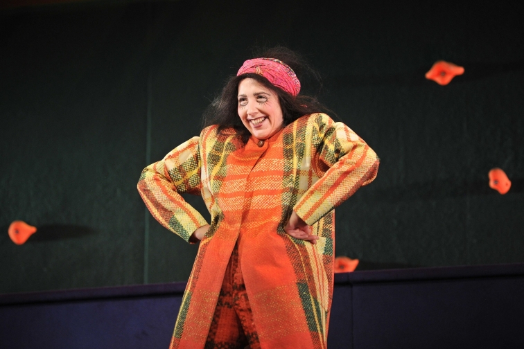 Tāpat lieka ir arī vēlme kompozicionāli sasaistīt izrādes daļas ar simboliskas pasakas priekšlasījumu, ko pārmaiņus veic aktieri. Katrs no trim aktieriem ik pa brīdim kā mazu starpspēli no baltām lapām izteiksmīgi lasa Kārļa Skalbes pasaku par milzi, kas devies pasaulē laimi meklēt, atstājot sava kalna turēšanu brāļa pārziņā. Izrādes materiāls ir pietiekami jaudīgs, lai būtu pašpietiekams bez mazās pasaku „līmes” ar simbolisko vēstījumu, ko šoreiz izmanto režisors.