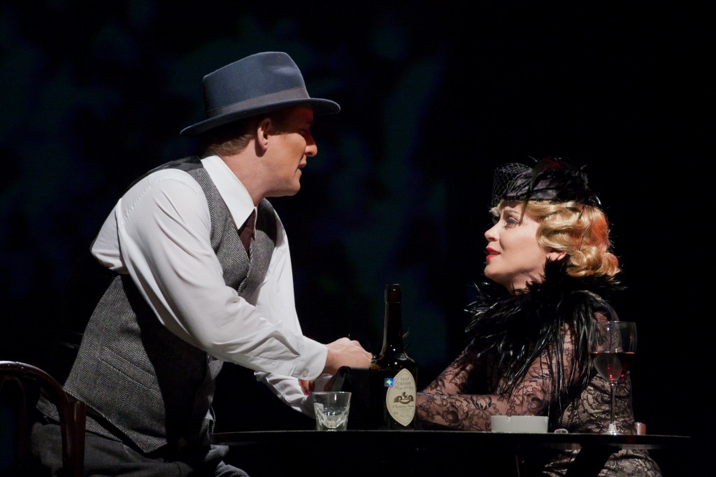 Taču atgriezīsimies pie pirmās ainas. Vivjēna, nosaucot slavenības, min to tautību un nodarbošanos. Piemēram, Hemingvejs, rakstnieks, amerikāņu; Remarks, rakstnieks, vācu; Lenija Rīfenštāle, kino režisore… Un tā tālāk. Sāc justies kā padomju ēras tautas universitātē, kur pulcējās ļaudis, kas vēlējās likvidēt savu kultūras analfabētismu. Kāpēc teātris grib pārņemt šo pagātnē grimušo tradīciju, skolnieciskā centībā informējot mūs par katram zināmiem faktiem? Tādēļ, ka uzlūko savus skatītājus par galēji tumsonīgiem nejēgām, kuri varētu, teiksim, Remarku uzskatīt par visu laiku ievērojamāko futbolistu?