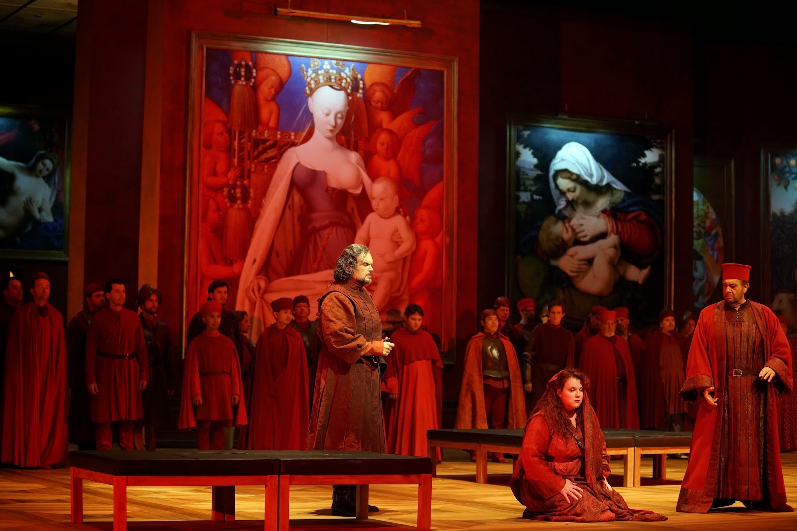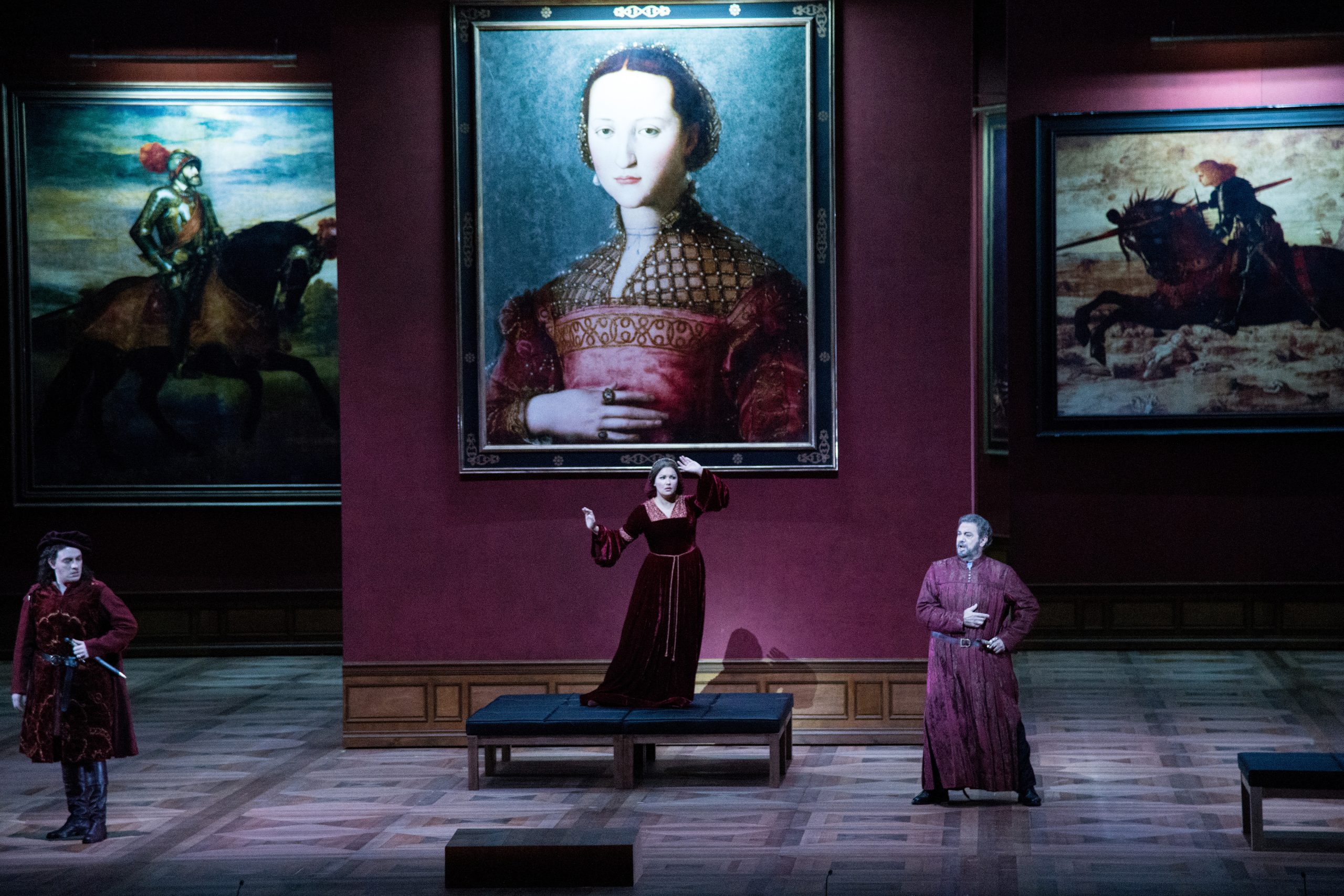 Renesanses glezniecība ir ne tikai sižeta atspēriena punkts, un Hermaņa izrādē tas ir ļoti asprātīgs. It kā galēji sadzīviskā situācijā mūsdienu muzejā, kurā gidi ņemas ar gleznās ieslēgtu, senu stāstu vēršanu vaļā un cita laika notikumu kustināšanu, vienā brīdī enerģijas paraujas vaļā un pagātne sāk nākt iekšā tagadnē. Caur muzeja personāla cilvēkiem, šiem mūsdienu medijiem, ierodas tēli no cita laika un sākas sirreāla pagātnes un tagadnes pārklāšanās. Šīs norises pavadonis ir lielisks humors. Gleznu apsargi un komentētāji konfrontācijā ar mākslas darbiem atraisās tādā emocionālā iztēles pakāpē, ka rosina domāt arī par ārpus Verdi operā mītošām tēmām – ko ar cilvēka psihi dara masīva saskarsme ar mākslu? Un kādas neprātīgas pasaules dzīvo no paskata visnormālākajos līdzcilvēkos? Anna Ņetrebko, kas jelkurā citā izrādē būtu izdevīgi izcentrēta, Hermaņa uzvedumā pat sākumā nav pamanāma. Ielikta sēdēt pašā skatuves malā, ģērbta tumšzilā, individualitāti nonivelējošā muzeja darbinieces uniformā, seja slēpta aiz biezām brillēm, gandrīz enerģētiska atbūtne. Līdz pamazām tieši viņas atveidotais dubulttēls ieņem centrālo vietu. Lai gan opera rakstīta dziedātāju kvartetam, Anna Ņetrebko izvirzās par izrādes centru. Tā notiek ne tikai viņas pārliecinošā mākslas spēka dēļ, bet arī tāpēc, ka Alvis Hermanis operas četrnieka attiecību pulsējošo līniju spriegumu neņemas izstrādāt, bet atstāj to izpildītāju pašu rokās un libretā ietvertā stāsta pašattīstības plūdumā.