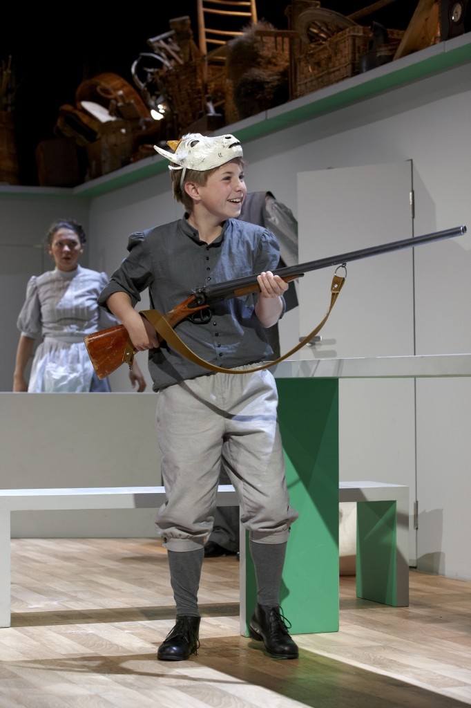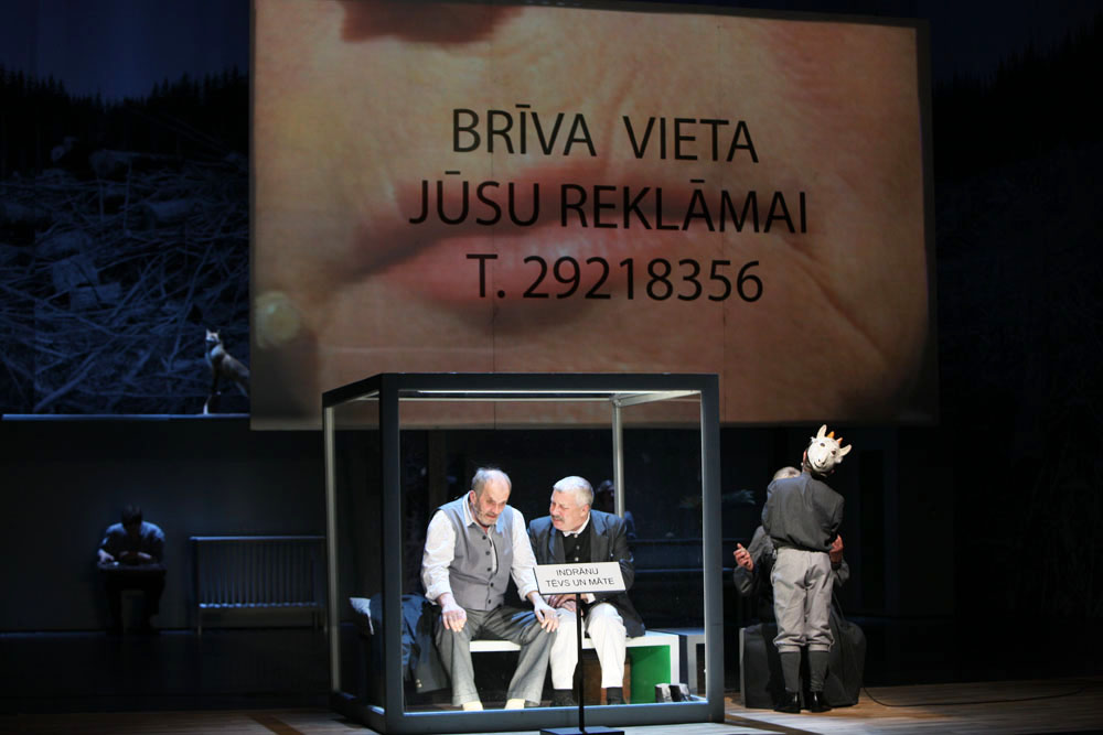 Savukārt jauno laiku cilvēki nemitīgi spēlē lomu spēles. Maskojas gan pārnestā, gan burtiskā nozīmē, sākot ar Daņilas Maligina izpausmēs ļoti organisko puišeli Edžiņu, kurš pie vecvecākiem ierodas kazlēna maskā, un beidzot ar Jekaterinas Frolovas sprigano Gusti, kura slepus atnes Indrānu tēvam uz pirtiņu putras bļodu, aiz cūkas maskas paslēpusies. Teorētiski maskām iespējamas vairākas funkcijas – tās var kalpot kā norāde uz indivīda identitātes virspusējību un mainību, tās var būt nolasāmas kā cilvēka un dzīvnieka līdzības zīmes (abi eksistē izdzīvošanas režīmā un ļaujas dabiskajiem instinktiem) vai interpretējamas pavisam didaktiski, proti, jaunie pret vecajiem izturas kā lopi. Tomēr režisora un aktieru sacerēto etīžu motoriskā kustību partitūra komplektā ar maskām palaikam atstāj samocītu iespaidu. Gan tāpēc, ka aktieriem, šķiet, ir grūti padarīt karikatūrisko skatuves uzvedību par tēla iekšējās pašsajūtas dabisku izpausmi, gan arī tāpēc, ka nekādu būtisku informāciju papildus tai, kas nolasāma izrādes telpiskajā risinājumā, šāda ekscentriska uzvedība nedod. Ieva – Olga Ņikuļina -, pūloties iedvest apņēmību neizlēmīgajā Aleksandra Maļikova Edvartā, ķeras pie nepastorāli vētraina seksa uz galda; Anastasijas Timošenko Zelmiņa neprātīgā eksaltācijā tver pēc Kārļa bildes pie sienas; Jeļenas Sigovas taisnības cīnītāja Līze nelaiž garām ne vismazāko izdevību nostāties Žannas d’Arkas pozā, bet Dmitrija Palejesa Kaukēns, veicot samierinātāja pienākumus, kā klaunādē smejas un mehāniski klanās abām karojošajām pusēm. Nav nekāds pārsteigums, ka vecie Indrāni šādā kontekstā atgādina drīzāk nevainīgus upurus nekā savas nelaimes kalējus.