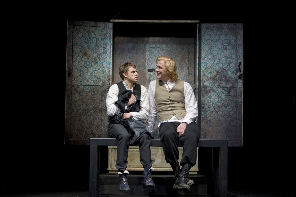 Gribas saukt šo izrādi par gotiski[i] skaistu. Nāves un izmisuma tēmas, bezcerība un cerības noliegums, spoki un asinssūcēji (spoki tiešā, asinssūcēji pārnestā nozīmē) un, jā, cilindrs un svārki pēc Vakareiropas modes (a la Søren Kierkegaard) kopumā veido drūmu, bet reizē viegli ironisku iespaidu par uzburtajiem Krievijas eiropeiskākās pilsētas 19. gadsimta iedzīvotājiem. Dzīvokļa izīrētāja izrādē ir vāciete, viesnīcas īpašnieks – ebrejs, bet izmisušie un sāpju plosītie, tie ir – jā, tie ir krievi. Krievu personāžu raksturi un Dostojevskis gotiskajiem elementiem pievieno pareizticīgo katedrāles plašumu un nebeidzamo liturģiju[ii]. Tiesa, attālinātu liturģisko dziedājumu atskaņojumu, kas nebeidzas visu izrādes laiku (vismaz tāds iespaids man radās), ir pievienojuši izrādes veidotāji, taču tas izdarīts tik līdzsvaroti un delikāti, ka netraucē, bet palīdz emocionāli uztvert uz skatuves notiekošo. Nepārtrauktību simbolizē arī viscaur virs skatuves pakārtās virves, kas Dostojevska romānu nelasījušu izrādes skatītāju (mani, piemēram) var uzvedināt uz domām, ka, ja uz skatuves ir izkārta virve, tad kāds no izrādes varoņiem tajā noteikti… . Taču, nē, ja noskatīsieties izrādi līdz beigām, tad redzēsiet, ka šis scenogrāfijas elements spēlē divējādu lomu – gan gotiski drūmo, gan pareizticīgi cerīgo – kā saikni ar debesīm.
