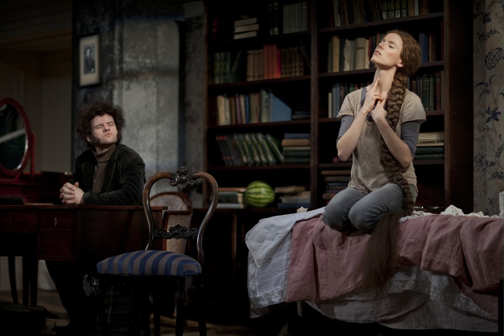 Maija Svarinska: Bet vai Tevi nekaitina, ka atstāsts vai komentāri brīžiem nav precīzi? Kāpēc, piemēram, salīdzinot 19. gadsimta sieviešu modi ar iepriekšējiem laikiem, kad bijis sarkano vaidziņu triumfs, ilustrācijai uz sienas tiek izgaismots nevis, teiksim, slavenais marķīzes de Pompadūras vai kņazienes Jekaterinas Daškovas portrets, kurā vaidziņi sārto kā košas rozes un ko veidojuši sava laikmeta tēlotājmākslas klasiķi Fransuā Bušē un Dmitrijs Ļevickis, bet Borisa Kustodijeva glezna „Tirgone dzer tēju”, kura tapusi pēc Puškina laikiem, proti, 1918. gadā, un kuras varonei nav nekādu sakaru ar aristokrātu paradumiem. Kāpēc Andris Freibergs ir ļāvies tādai atsaucei? Viņš savas scenogrāfijas detaļās būtībā nemaz nespēlējas ar laiku, arī radiatori pie sienas, kas dažiem šķiet vienīgi mākslinieka joks, absolūti atbilst tā gadsimta ekskluzīvam dzīves veidam, ko ieviesis, starp citu, jau Pēteris Pirmais. Līdzīgu jautājumu diemžēl man ir daudz: Puškins raksta, ka Oņegins sēdēja vannā ik rītu, Larina gāja pirtī katru sestdienu, bet izrādē nez kāpēc ir akcentēta smirdoņa, sviedru lāses – kaut gan vēdeklis ir apbrīnojams darbarīks, iesaku pārbaudīt to praksē. Kāpēc dendijs Oņegins ir tik jokaini spocīgs? Vai mūsdienu vīriešu dēļ, kuri var nesaprast, kā iespējams trīs stundas veltīt spogulim? Un kāpēc Puškinu rāda kā pērtiķi? Vai ilustrējot dzejnieka teikto: „От обезьяны до гения один шаг”[ii]?