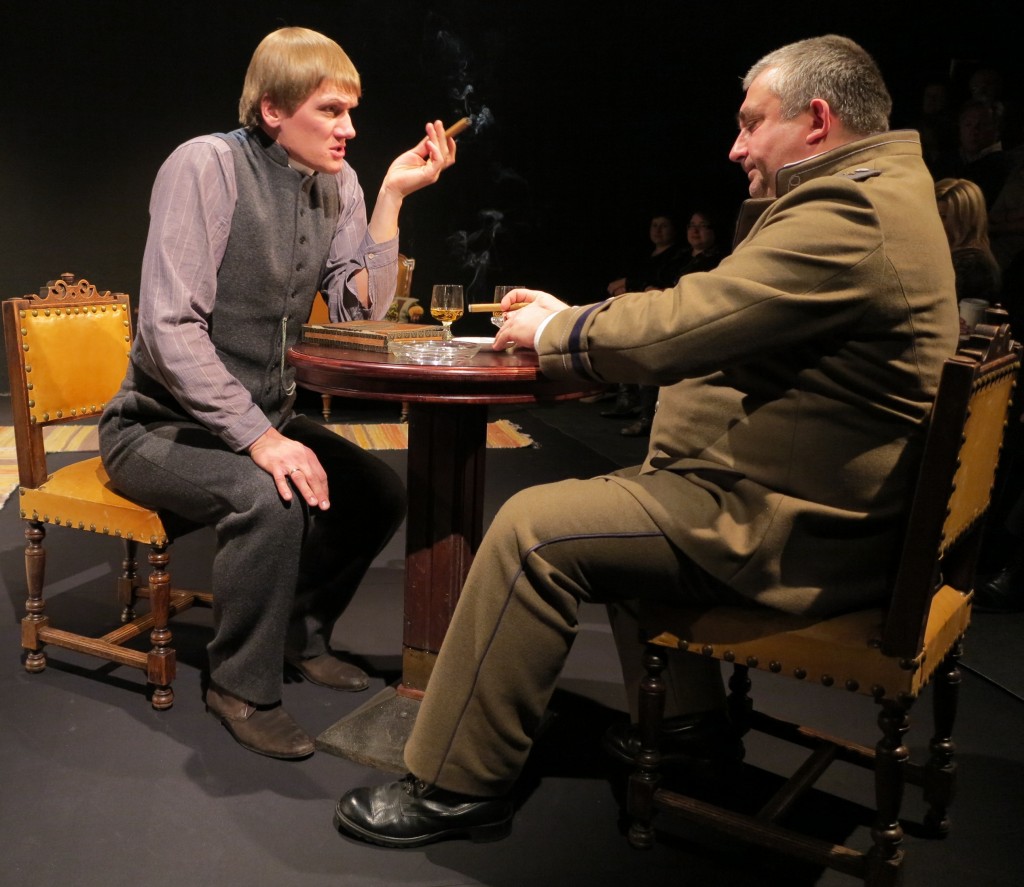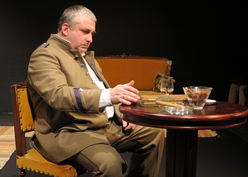Gundars Āboliņš, pretēji lugai, kurā rotmistrs tik tiešām piedzīvo zināmu prāta aptumsumu, nespēlē sava varoņa ārprātu. Pat mēģinājums šaut uz meitu šķiet drīzāk dīvaina rotaļa, bet revolveris ir vairāk līdzīgs rotaļlietai nekā reālam ierocim. Un kad rotmistrs izgāž durvis, lai tiktu laukā no pazemojošā gūsta, viņa rokās ir vijole, bet sejā spoguļojas atsvešinātība no bezjēdzīgās situācijas, dziļa iegremdēšanās sevī. Es drīzāk teiktu, ka izrādes otrajā daļā rotmistrs nonāk stāvoklī, ko varam saukt par bērnišķīgu. Bet varbūt par ģēnijam adekvātu. Viņš atmet visas nosacītības, visu iemācīto, pārmantoto, pieņemto, grib nodibināt pats savu saprastu patiesību par pasauli, cilvēku attiecībām. Un tādā veidā, nonācis pusmūžā, grib attīrīties no gadiem, ko vadījis pēc citu nodibinātas patiesības jeb varbūt meliem. Viņš, līdzīgi Ļevam Tolstojam, dodas uz savu likteni, tikai viņu Astapovas stacija piemeklē paša mājā. Par rotmistra ceļu no sabiedrības uzspiestās lomas uz sevi jeb vienkārši cilvēku liecina arī kāda simboliska norise pirmās ainas beigās, kad aktieris novelk slikti uzšūto virsnieka mundieri (tērpu māksliniece Kristīne Jurjāne).