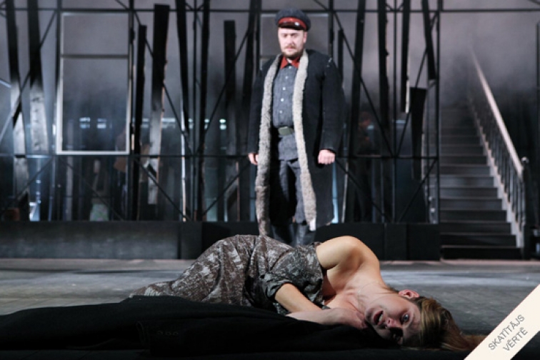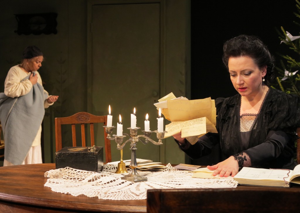 Māra Ķimele Augusta Strindberga lugu iestudējusi Jaunā Rīgas teātra Talsu ielas zālē, kur scenogrāfs Rudolfs Bekičs ar minimāliem līdzekļiem iekārtojis mājīgu telpu. Divi gaiši austi celiņi uz tumšās grīdas veido krustu, brīvi izvietotas dažas stila mēbeļu grupas (sekretārs, dīvāniņš, lielāks un mazāks galds ar krēsliem). Baltā siena ar logiem telpas galā (uz palodzēm istabas augi) paver skatu uz ziemas dārzu un vienlaikus kalpo par kulisēm. Skatītāju sēdvietas, kas iekļauj spēles laukumu no divām pusēm, veido 90 grādu leņķi.