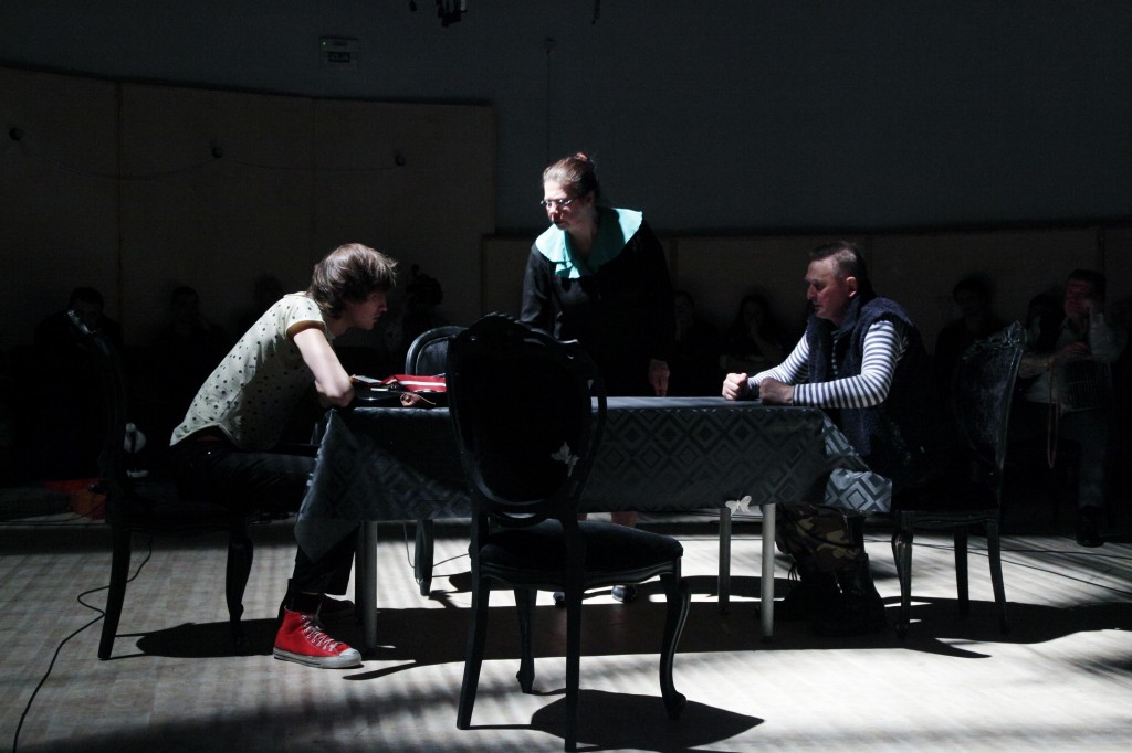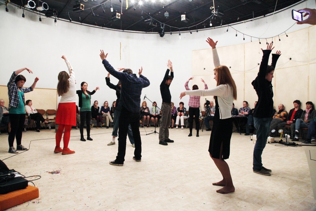Uzvedumā ir daudz performatīvu elementu. Piemēram, prologs norit tumsā, telpu iegaismo vien reti gaismas zaķīši, ko met ar vientuļu, paslēptu prožektoru apgaismota spoguļa gabaliņiem aplīmēta bumba pie griestiem. Skan mūzika, apkārt spēles laukumam četrrāpus pārvietojas piecu jauniešu grupa melnās drēbēs, kapucēs paslēptām galvām. Viņi, skanot mūzikai, aprāpo apkārt laukumam reizes divas trīs, uzgrūžoties skatītāju kājām, kas izraisa klusinātus kliedzienus. Starpbrīdī grupa spēles laukumā sniedz asprātīgu deju vēstures performanci. Kā šķiet, šis nav gadījums, kur tumšajiem, ložņājošajiem stāviem būtu piešķirta kāda jēdzieniska, respektīvi, simboliska nozīme, teiksim, viņi iemiesotu varoņu zemapziņas rēgus. Gan šie rēgi, gan starpbrīža priekšnesums, gan vairāki citi uzveduma aspekti, piemēram, publikai redzot, tiek uzlikta mūzika, izmantojot laukuma malā novietotu magnetofonu. Vai – aktieri pirms katras ainas uzraksta, kura diena varoņu dzīvē tiks spēlēta – uzraksti tiek demonstrēti uz sienas kā ekrāna. Šie paņēmieni izsit no ilūzijas, ka mūsu priekšā ir dzīve, atgādinot uzveduma spēles dabu. Bet ne tikai. Manuprāt, šai gadījumā mērķis bija tālāks, līdzīgs kā V. Meikšāna izrādē Nacionālajā teātrī Septiņi Fausti – uzsvērt, ka tēli vienlaikus ir aktieri, respektīvi, privātpersonas, tādā veidā nospēlējot plūstošu pāreju starp mākslu un dzīvi un nodrošinot izrādei papildus bonusu – dzīves realitātes zīmogu. Kaut arī nepārprotami konsekventi tas nav realizējies, tomēr tendence, manuprāt, jūtama. Tas rada kādu mulsinošu, bet nevis atgrūžošu, tieši otrādi, iekšā ievelkošu sajūtu. Izņemot E.Vāni Meitiņas lomā un Aigaru Vilimu Putnu vīra lomā, kuri spēlē izteiksmīgi, varbūt pat pārāk, un paliek vienīgi teātra sfērā, pārējie aktieri visai labi realizē sarežģīto uzdevumu – būt tēlā un vienlaikus spēt pāriet privātpersonas statusā, bet pēc tam peldēt atkal atpakaļ uz tēlu. Tas teicami izdodas gan Mārai Mennikai (Liene), gan Sanitai Pušpurei (Paula). Arī Imantam Stradam Tetera lomā, kurš otrajā cēlienā ar saviem monologiem izvēršas bezmaz par centrālo cilvēka vientulības filozofu. Aktiera runas maniere piesaista uzmanību, viņa tēla rūgtums par vientulību aizķer, lai gan pašsacerētie teksti, kam jāpierāda šo izjūtu izcelsme, šķita pārmēru infantili, atbilstoši pusaudzim, ne pieaugušam vīrietim. (Tur bija kaut kas tādā garā: es 5. klasē Lindu aizstāvēju, kad citi par viņu ņirgājās, bet Linda par mani smējās kopā ar citiem, kad es aizmirsu fizkultūras tērpu un skolotāja man lika skriet zeķēs…)