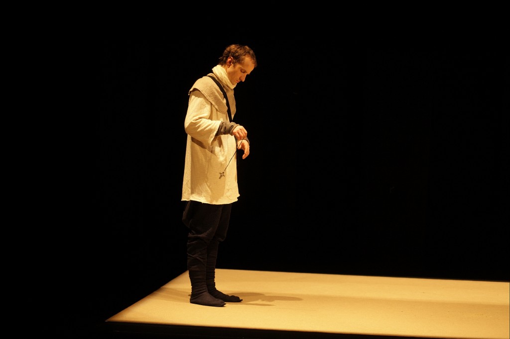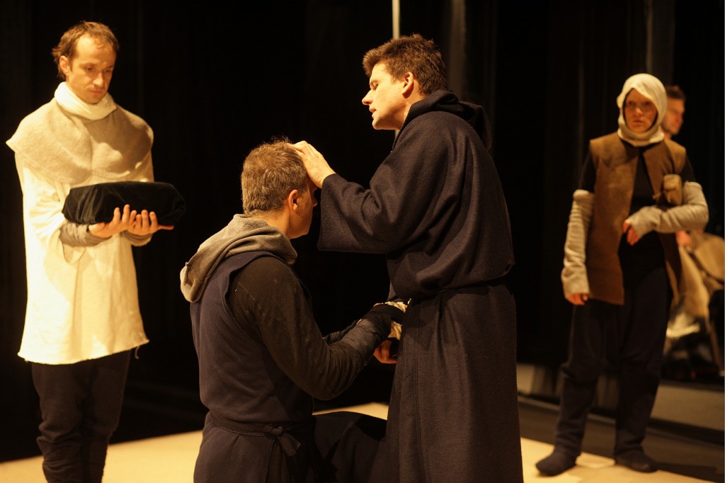 Andris Keišs vācieti brāli Berunu un letu veco kalpu Čuini spēlē vienādi, tā kā grūti atšķirt, kad aktieris iemieso vienu un kad otru. Abos gadījumos viņš ir viegli ieliecies ceļos, nedaudz pavēris muti un viņa sejā rotājas vientiesīgs smaids. Smaids nezūd ne tad, kad viņš, līdzīgi citiem, vēzējas ar milzīgu koka vāli, ne tad, kad izrādes laikā, cik jaušams, neatšķirdams dzīvi no mākslas, pa īstam nožņaudz G. Zariņas tēloto zēnu-izrādes personāžu, kam gan neviens – ne izrādes režisors, ne izrādes izrādē dalībnieki nepievērš nekādu uzmanību. B. Broka komiski atveido vēl līvu prostitūtu Mintu, kurai izrādē par praviešiem tiek uzticēta eņģeļa loma. (Te režisors ignorējis neapšaubāmi zināmo vēsturisko patiesību, ka viduslaiku reliģiskajās izrādēs sievietes nepiedalījās, tāpat kā faktu, ka tajās neviens neaplaudēja.)