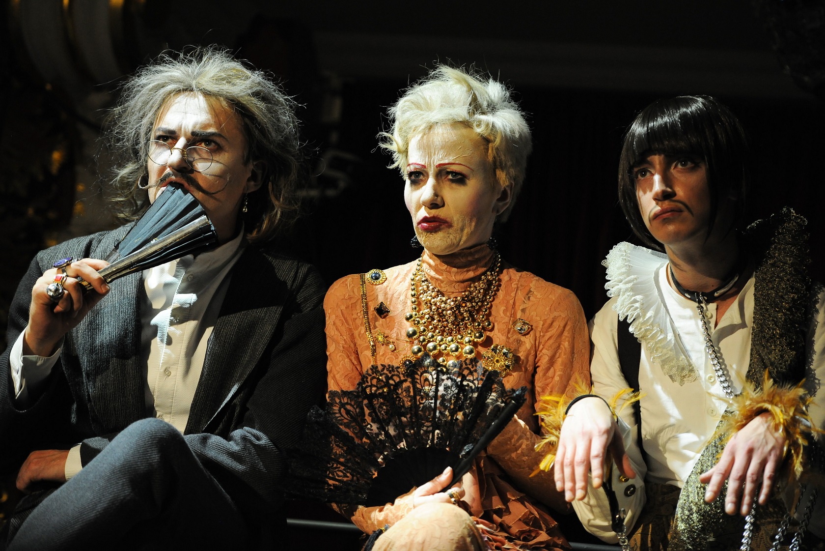 Minētie personāži, kam vēl jāpieskaita Ditas Lūriņas Liduvina, kuras seja un augums gan pasaudzēti, kustas mehāniskām kustībām vai statiski stāv, iegrimuši sevī, sarunājoties skaļi smejas, ātri vai tīši lēni runā tekstu. (Ainu starplaikos tēli kāpelē pa abstraktas metāliskas konstrukcijas kāpnēm un tiltiņiem skatuves centrālajā daļā, dažkārt apsēžoties un sastingstot.) Šī dīvaiņu kompānija, kura rūpīgi sarežisēta, drīzāk atgādina uzvilktas lelles, ne dzīvus cilvēkus. Varētu būt labs fons, lai izspēlētu mūžveco un allaž aktuālo tēmu par dzīva cilvēka vientulību iedomātā vai reālā marionešu sabiedrībā, kur dzīvnieki ir cilvēciskotāki nekā paši radības kroņi – Uldis Siliņš suni Orfeju un Jurģis Spulenieks kanārijputniņu Pičinu atveido pantomīmas tehnikā. Svarīgi gan būtu dot vismaz mājienu, vai šis nedzīvās un kroplās pasaules tēls ir realitāte, ko veido Gunāra Grasberga Autora ne līdz galam uzrakstītie tēli, vai arī tas ir Augusto iekaisušo smadzeņu subjektīvais redzējums. Taču šādu norāžu nav.