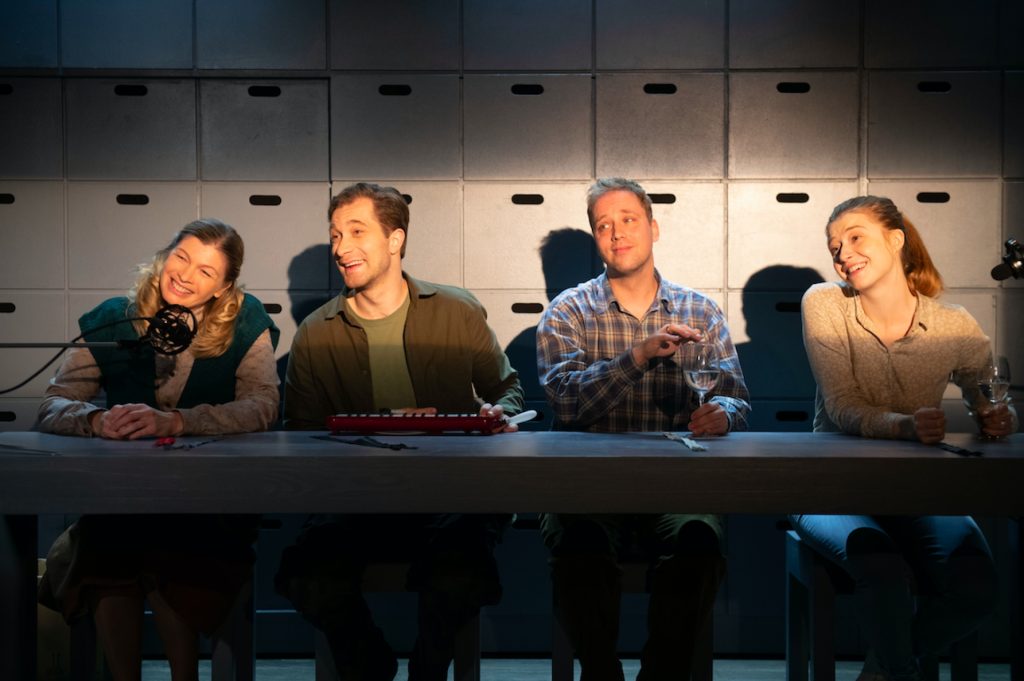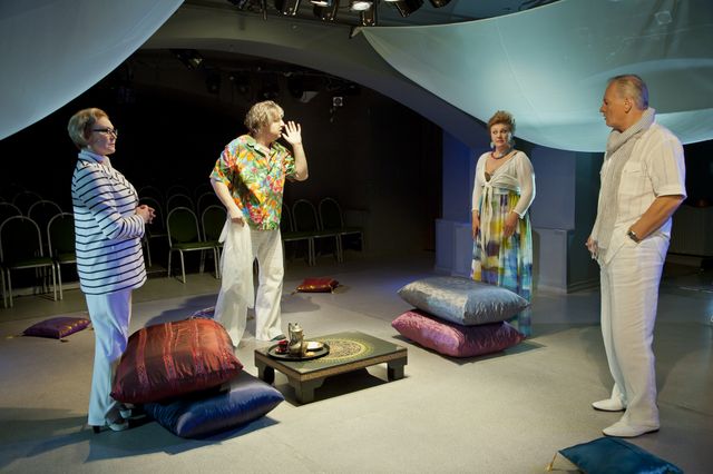 Aktieru zāles telpa iekārtota buduāra atmosfērā – aizkari, spilveni, maza strūklaka. Nekā atmiņā paliekoša, tāpat tas attiecas uz muzikālo fonu (Scenogrāfija – A. Arnis, muzikālais noformējums – Valdis Zilveris). Galvenie lugas varoņi ir labi situēts vecāks pāris Kārlis un Mona (Voldemārs Šoriņš un Lāsma Kugrēna) un gadus desmit jaunākie Oskars un Sabrīna (Juris Hiršs un Ilze Rūdolfa). Kārlis – preses koncerna valdes priekšsēdētājs (kas pats arī uzraksta pa rakstiņam apmaiņā pret tūrisma ceļazīmi), Mona – mājsaimniece. Oskars – brīvmākslinieks, pieticīgāk situēts, viņa sieva kaut kad pasen niekojusies modes žurnālistikā, cik noprotams, pašlaik galvenokārt nodarbojas ar iepirkšanos un koncertu apmeklēšanu.