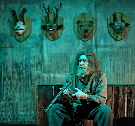 Aivara Žukovska un Jāņa Bijubena scenogrāfija uz skatuves veido mazu meža mājas istabiņu ar rupjām koka sienām un durvīm, apjomīgu dēļu galdu, metāla krāsni, trīs plauktiem ar vecām kārbām, netīru spoguli, kurā knapi var saskatīt savu atspulgu, drēbju pakaramo ar veco mēteli un pāris kastēm, kurās samestas visādas drazas. Īsta vientuļnieka miga, kur nav ne miņas no mājīguma. Šo noskaņu tikai paspilgtina četras zvēru galvu trofejas, kas piesistas pie sienas, kā arī neomulīgie zvēru skatieni, kuri nepārtraukti urbjas skatītājos un izrādes beigās pat sāk spīdēt ar sarkanu gaismu.