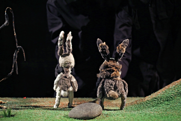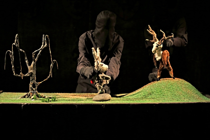 Kad tiek izmantotas mazās lelles, kuras darbojas uz galda un parāda trofeju atmiņu ainas no pagātnes, aktieris ir redzams fiziski, bet nav uzmanības fokusā, jo aktieri ir tērpti melnā un viņu sejas slēpjas zem auduma „maisiem”. Aktieri vada lelles gan pa vienam, gan divatā un trijatā, radot vissīkākās nianses, parādot gaitu, žestus. Katrai lellei ir izkoptas kustības, kas to padara unikālu. Pat ja vienlaikus darbojas trīs zaķi (uz galda leļļu ir vairāk nekā trofeju), katrs ir atšķirīgs. Šīs lelles ir trofeju tēlu miniatūras, kas tomēr ārēji ir ļoti atšķirīgas no oriģināla – ne tik groteskas un baisas, tie drīzāk ir cilvēkveidīgie zvēri, kas staigā uz divām kājām un kuriem pārsvarā ir cilvēku ķermeņu proporcijas. Šāda pārmaiņa var tikt skaidrota ar to, ka atmiņas ir atskatīšanās kaut kur pagātnē – tālumā, kur viss ir mazāks un subjektīvi citādāks, nekā bija īstenībā. Uzvedības ziņā tie ir zvēri ar cilvēka īpašībām – tiem ir sava civilizēta pasaulīte, tie filozofē par dzīvi, lieto alkoholu, izbauda seksu trijatā, izvēlas mežā galveno… Dzīvnieks tiek vienādots ar cilvēku, tāpat kā lelle ir līdzvērtīga aktierim.