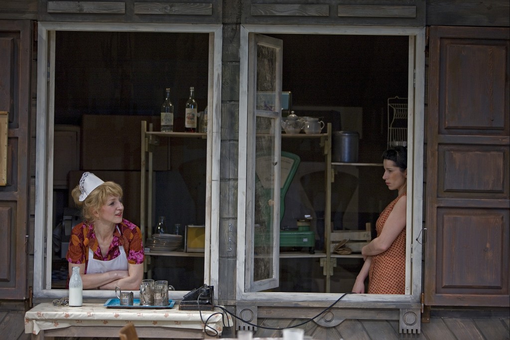 Kaspara Znotiņa alkoholiķis Dergačovs ar pielīmētām ūsām un vienu izstieptu nekustīgu kāju lēkšo pa skatuvi, pārnēsādams pussatrunējušas kastes un liedams rīklē vienu šņabja glāzi pakaļ otrai, pie tam nepārtraukti smīnēdams. Sandras Zvīgules Kaškinas sejā arī nenodziest negatīva tēla aprobežotais smaids, kad viņa temperamentīgi un izaicinoši izrādes laikā vairakkārt izsper Valentīnas puķu dārziņa žogu, augstu celdama kāju un tā pauzdama savu greizsirdību pret meiteni. Tik neticami rupjiem un ārišķīgiem paņēmieniem aktrise tēlo baudkāru liekulīgu mietpilsoni, ka negribas ticēt savām acīm. Guna Zariņa, citkārt virtuozā krāsainu raksturu smalkā atveidotāja, arī ķērusies pie ārišķīgiem un pārspīlētiem izteiksmes līdzekļiem, lai arī tie ir nedaudz gaumīgāki nekā Sandrai Zvīgulei. Uzpolsterētām krūtīm, apspīlētā kleitā viņa slauka grīdu, zemu noliekdamās un allaž kārdinot pagriezusi dibenu pret Dergačovu. Entuziastiski sit odus (to dara arī citi – taiga taču!), manierīgi pļāpā pa telefonu, pūlēdamās raisīt sava piedzīvotāja greizsirdību. Arī Ivars Krasts grāmatveža Mečetkina aprobežotību cenšas nospēlēt vienīgi ar uzpolsterēta vēdera palīdzību. It kā viņa korpulence būtu iemesls Valentīnas vienaldzībai. Tāda šoreiz ir režisora izpratne par lietu sakarībām. Imants Vekmanis uzaicināts uz Pomigailova lomu, lai trīsreiz pārietu skatuvei ar elektrības vadu rulli, vienreiz nostrostētu savu meitu Valentīnu un finālā uzkāptu stabā un tur paliktu, kamēr citi aktieri iznāk uz paklanīšanos.