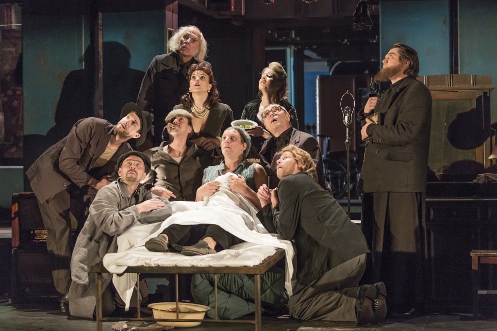 Izrādes mizanscēnu veidojums ļauj skaidri izšķirt individuālā varoņa un kolektīva pretstatu. Uz skatuves bez trīs galveno lomu atveidotājiem parādās 35 (!) aktieri, kuri spēlē dažāda nozīmīguma lomas. Teju visi aktieri spēlē izteikti groteskā, izkāpinātā veidā, kas diemžēl iezīmē neviendabīgu aktierspēles kvalitāti. Pa skatuvi staigājošas karikatūras spēlē Artūrs Robežnieks tēva Elpīdija varenajā, taču pārspīlētu hroniska alkoholisma izpausmju (streipuļošanas, šļupstēšanas u.tml.) pārņemtajā figūrā un Juris Žagars, kurš nojaušamā lomas metafiziskā rakstura vietā atmasko nebūt ne inteliģentu personu, kas pati sevi dēvē par „krievu inteliģences pārstāvi”. Plakātisku „upurjēra” funkciju režisors piešķīris Mārtiņa Poča aizkustinošā patiesīgumā tēlotajam kurlmēmajam pusim Fedjam. No puslīdz individualizēto „fona” varoņu loka izceļas vien Ērikas Eglijas kaislīgā Raisa Fiļipovna, Sarmītes Rubules enerģiski spēlētā sabiedriskās dzīves mūžīgā organizatore Margarita Ivanovna un Laura Subatnieka līdzjūtību raisošais kaimiņš ar komisko „acu defektu”.