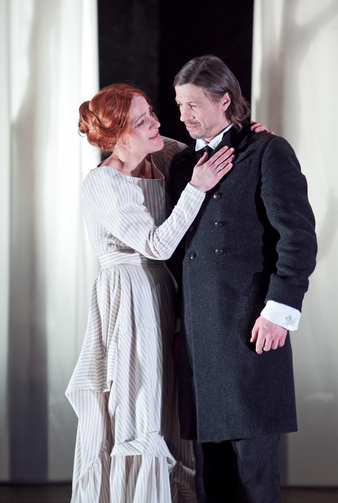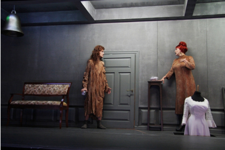 Uz režisora neiedziļināšanos norāda arī visai eklektiskā aktierspēlē, jo gaisu nenokaitē un videi nepiestāv ne Egona Dombrovska Georga Stibeļova monotonā pašsavaldība, ne Ineses Kučinskas Katrīnas Ivanovnas ēteriskā dūdošana, kas nenāk par labu arī kopējās noskaņas radīšanai. Pie tam, raugoties uz šiem aktierdarbiem un arī Kaspara Goda veikumu mīlnieka Arkādija Mentikova lomā, tie attāli atgādina trijotnes iespēto izrādē „Ragana” pērnsezon. Pie tam kādu nianšu trūkuma dēļ galveno varoņu sniegumā vai režisoriskas kļūmes dēļ izrādē nav lūzuma punkta, kas sasaistītu pirmā cēliena beigās rādīto pušu izlīgumu un otrā cēliena spējos pavērsienus, kur nelaimīgā sieviete jau nokļuvusi kādu mistisku spēku varā, kas to burtiski piekaļ videi un baudām, kas nav domātas viņai.