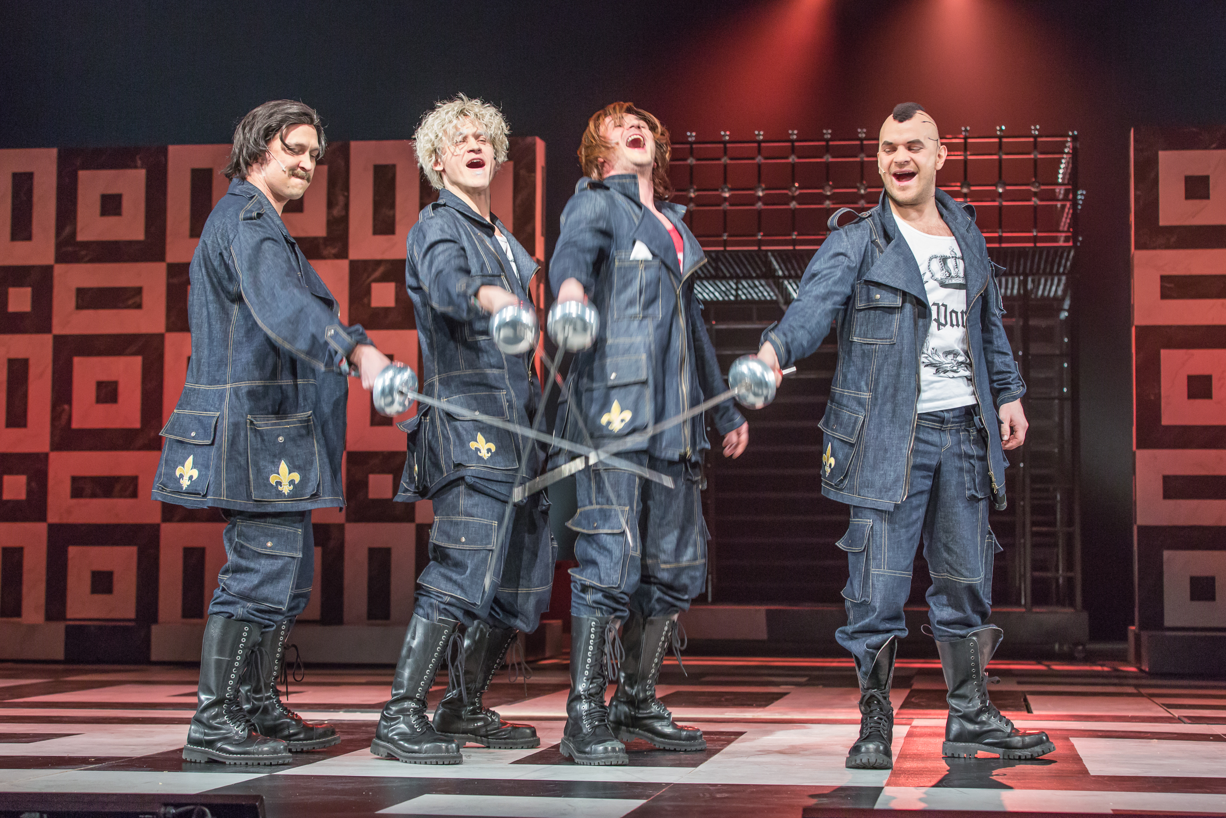 Kārļa Lāča oriģināli sacerētās un aranžētās mūzikas pavadījumā risinās asprātīgi horeografēti dekoratīvi kautiņi starp disciplinētajiem tādā kā safari stilā ģērbtajiem kardināla gvardiem, kurus atveido Gints Andžāns, Dainis Grūbe un Mārtiņš Počs, un apšļukušās džinsa auduma biksēs un t-kreklos ietērptajiem plebejiskajiem musketieriem. Aktieri dejo saskanīgi, īpaši izceļas Gints Andžāns ar savu spēju efektīgajām kustībām piešķirt viegli ironisku niansi. Teju trešo daļu no trīs stundu garās izrādes laika aizņem dziesmu repertuārs, kas par spīti kaleidoskopiskumam kultūru ziņā – „Hey, Jude!”, „Пять минут”, „Champs Élysées”, „Es mīlu tevi tā, kā priede aug…” u.t.jpr. – galu galā ļauj izkristalizēties latviešu nacionālajiem arhetipiem. Tie, kā liekas, ir iebūvēti arī izrādes pamatā.