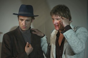 Izrādē šo divdomību šobrīd drīzāk nospēlē Kaspars Znotiņš, kura varonis Džonija dualitāti organiski sevī pārvarēt spēj vien tādēļ, ka viņš mīl konkrēto cilvēku. Vienlaikus aktieris izspēlē arī autora burvīgo pašironiju – Bruno / biogrāfs iemieso klišejiskus un patiesus mākslinieku un mākslas apskatnieku attiecību modeļus, psiholoģijas īpatnības. Izrāde ir ļoti spēcīga vairākās ainās, kurās sarunājas Kaspara Znotiņa un Gata Gāgas varoņi. Katrs par savu. Teksti viens otru izslēdzoši, spiež skatītāju pieņemt lēmumu – kura pusē atrasties, tas ir, atzīt, ka sarunājas normālais un vājprātīgais vai arī konservatīvi domājošais un ģēnijs. Aktieri nospēlē savas lomas smalki, ļaujot saprast to, ko Kortasāra tekstā ne vienmēr tik skaidri iespējams uztvert – ka atšķiras tikai valoda, bet runāts tiek par vienu. Ka taisnība līdz ar to ir vienlaikus abiem.