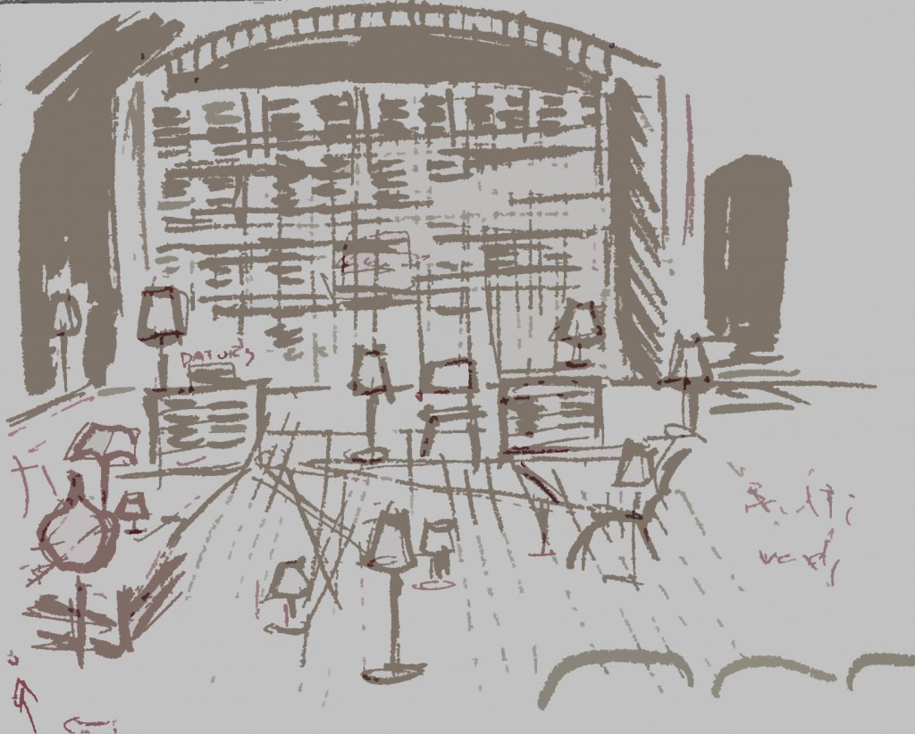 Visvairāk runātā teksta parādās uzveduma beigās. Skan balss, bet runātāji/runātājs paliek neredzams. Šie pāris teikumi, kas, iespējams, ir citāts no konkrēta literāra darba, ieskicē laiktelpu: agrs rīts, kad tik tikko pārkāpta robeža starp nakti un ausmu. Parādās arī vides aprises: restorāns vai kafejnīca, kurā pavadīta nakts, ļaujot īslaicīgi izdzist laika robežām, iedalījumam.