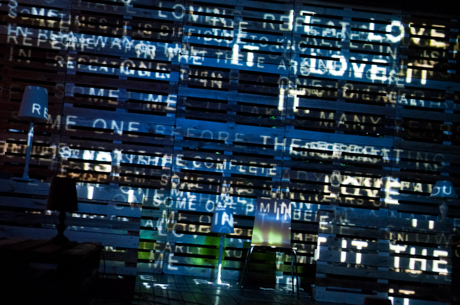 Noskaņas tapšanā liela nozīme ir video projekcijām. Tomēr izvēlēts pietiekami rafinēts paņēmiens, nepadarot projekciju par seklu, plakātisku „bildi uz sienas”, ekrāna: fonā nav tradicionāla, balta, gluda ekrāna. Projekcijas tiek rādītas uz koka palešu neviendabīgā, svītrainā fona, padarot attēlu šķietami saskaldītāku, vibrējošāku, grūtāk nolasāmu. Video „stāstam” tiek atņemta daļa konkrētības, padarot to aizšifrētāku, un tas šajā gadījumā ir iederīgi, ievirzot to vispārinājuma plaknē. Ar projekcijām tiek veiktas dažādas smalkas manipulācijas: uzveduma gaitā, piemēram, video attēls tiek projicēts uz divām paletēm, kas frontāli novietotas (vertikālā stāvoklī) pret skatītāju. Tad uz lielās fona sienas tiek projicēts pavisam miniatūrs attēls, kas pamazām palielinās, konkretizējas. Siena tiek izgaismota un video aizņem teju visu tās platību u. t. t.