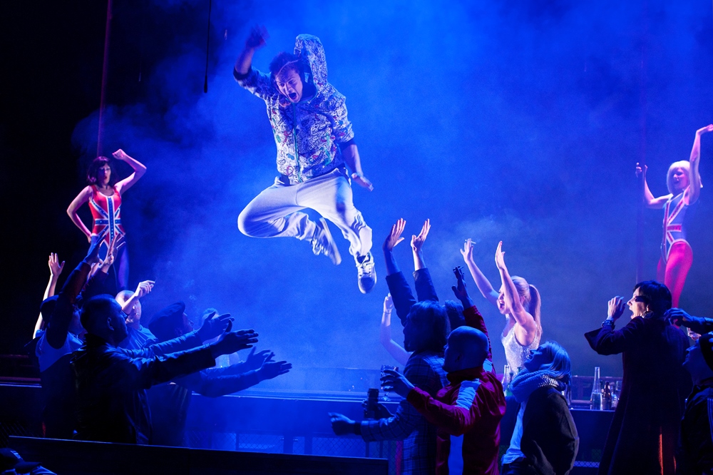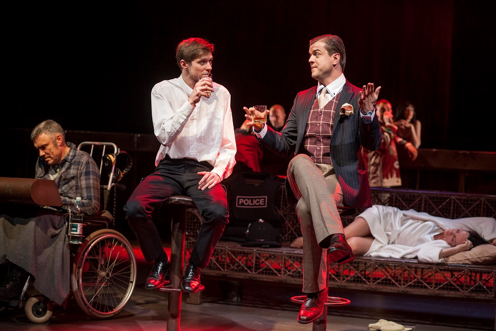 Nobriedušais, pieredzi guvušais Bens Jura Žagara izpildījumā, sēžot ratiņkrēslā, pārliecina ar grimasēm un balsi. Spēcīga ir otrā cēliena noslēguma aina, kurā jaunais D. Grūbes Bens kopā ar Vandalu dodas lēkt lejā no Temzas tilta, lai izpeldētos. Kad abi slīkst, pūlis (visi pārējie aktieri) viņus ceļ uz augšu, veidojot krustus (krustā sistā Jēzus Kristus motīvs izmantots vairākkārt, taču tas nepārsteidz, jo bieži redzēts jau iepriekš teātrī); horizontālais scenogrāfijas stienis reizē ar krustu veido arī ūdens virsmu, virs kuras turas abi slīkstošie. Šajā brīdī mans skatiens lielākoties pievērsts neaktīvajai, bet spēcīgai priekšplāna darbībai, proti, J. Žagara atveidotajam Benam, kura seja ir izgaismota (apkārt tumsa), bet grimases vēstī par tuvēju traģēdiju. Līdzīgi Žagara mīmika par tuvējiem notikumiem un to raksturu vēstīja visā izrādē. Ievas Segliņas atveidotajā Olgas tēlā novēroju nepietiekami izstrādātu krievu valodas akcentu, kas brīžiem pat ļoti kaitināja. Daudziem skatītājiem, iespējams, šokējošs varētu šķist Olgas apgānīšanas skats, taču mani tas, līdzīgi kā ar Jēzu Kristu krustā, nepārsteidza, jo bija paredzams. Artūra Dīča (brits Harijs) tēlojumā brīžiem pietrūka pārliecības plastikā un horeogrāfiskās meistarības. Taču, par plastiku kopumā runājot, ļoti baudāms ir brīdis, kurā Bens rokās nes stāvošu Danu kā graciozu statuju, nevainojami noturot līdzsvaru. Turpretī skats ar A. Dīci Kristus lomā ir režisoriski iespaidīgs, – puskails Kristus (zīmīgi, ka atveido A. Dīcis, jo viņa spēlētais Harijs konfrontē ar Benu) pie fonā attēlota krusta ar alus skārdeni rokās, un identiski sinhrona mizanscēna priekšplānā, kuru izpilda Edijs (nav skaidrs, kāpēc tieši Edijs, iespējams, tālab, ka tieši šis tēls piedzīvo visveiksmīgāko emigrēšanu uz karaļvalsti – tiešā nozīmē, jo iekļūst karaliskās ģimenes vidē).