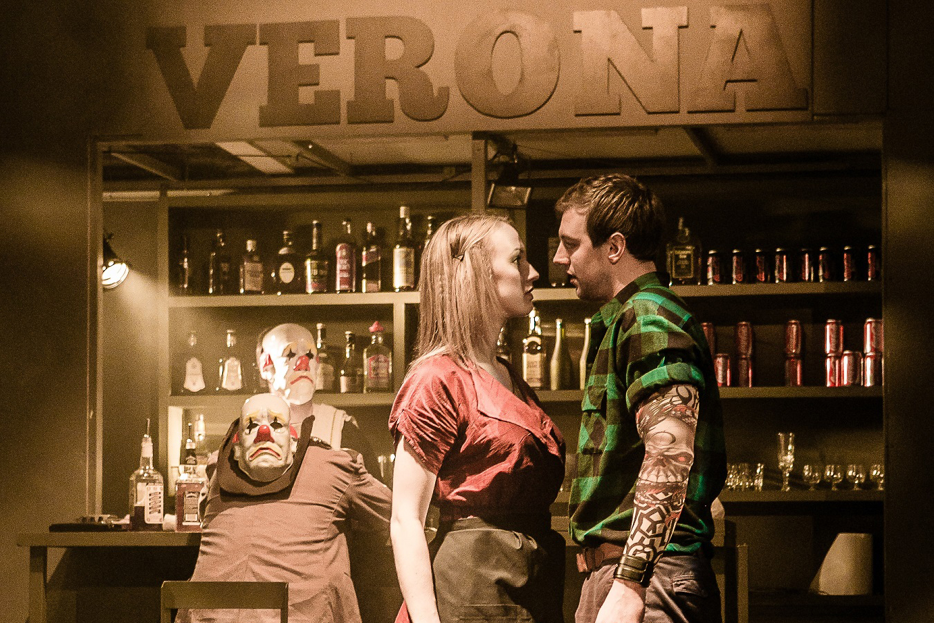 Mārtiņš Eihe lugas darbību pārcēlis uz mūsdienu Ameriku, Romeo un Džuljetas mīlasstāstu ievietojot „eksotiskā” un asociācijām bagātā laiktelpā – robustā bārā, kam asprātīgi piedēvēts nosaukums „Verona”. Režisors (viņš arī scenogrāfs) darbības telpu iekārtojis precīzi un ar izdomu – aiz bāra letes plauktos lielā kvantitātē redzams Amerikāņu patērētājkultūras simbols Coca Cola, netrūkst meditatīvas dzīvās mūzikas, kas mainās atbilstoši izrādes intonācijai, grotesku līnijdeju, „atklāsmes brīžu” pie stūrī novietotajām klavierēm, kā arī bāra grīdas, kas izrādes laikā kļūst arvien lipīgāka un netīrāka, it kā metaforiski atgādinot par šeit notikušajiem konfliktiem.