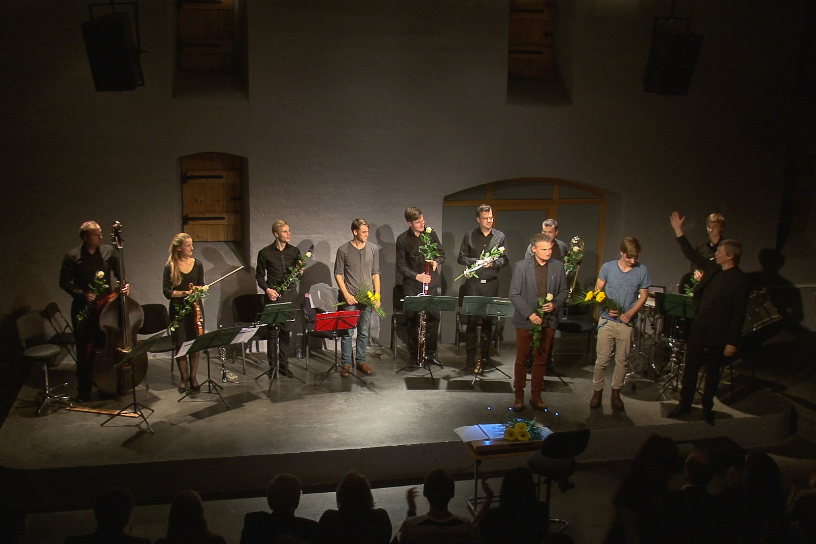 Cauri zālei, skanot skatītāju aplausiem, uz nelielās Spīķeru koncertzāles skatuves uznāk Sinfonietta Rīga mūziķi, diriģents Normunds Šnē un aktieris Edgars Samītis. Viņš iznāk priekšā, savilcis vienu uz otra vairākus T-krekliņus ar dažādiem uzrakstiem. Samītis, būdams paštēlā, jokojas, stāsta, ka par aktieri kļuvis tāpēc, ka negribējis strādāt un uz eksāmeniem faktiski aizgājis līdzi draugam, bet vēlāk sapratis, ka jāstrādā tomēr ir, un tas nozīmē pildīt režisora dotos uzdevumus. Velkot nost krekliņu aiz krekliņa, aktieris ērmojas, vaikstoties kā uzzīmētais mērkaķis, etīdēs atveidojot uzrakstus “Show Your Emotion”, “Hot Chick” vai “Welcome to the Gun Show”. Tad joki beidzas, un aktieris paziņo, ka šovakar viņa uzdevums ir mēģināt saprast, kā tas ir – būt par karavīru. Vēl viņš atklāj, ka nekad nav uz kādu šāvis un arī uz viņu neviens nav šāvis.
