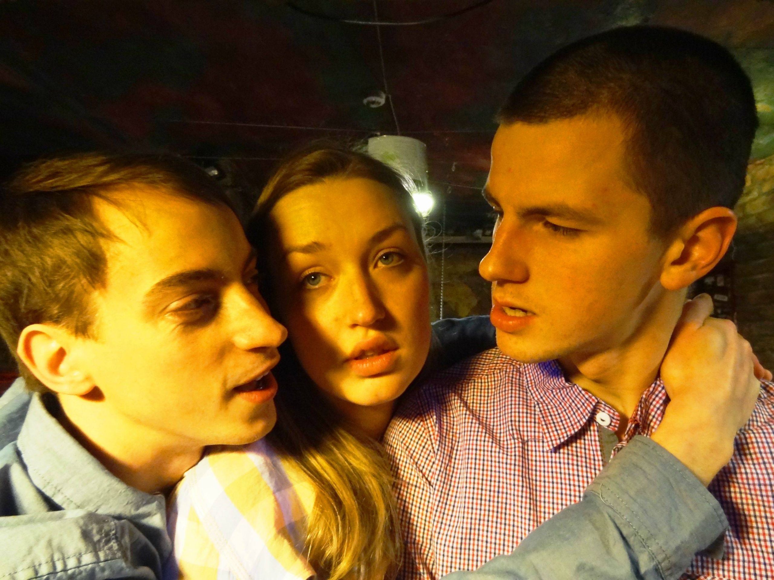 Jurģis Spulenieks, Laura Siliņa un Kristaps Ķeselis “Teātra TT” izrādē “Minga rēgi” (2013) // Publicitātes foto
