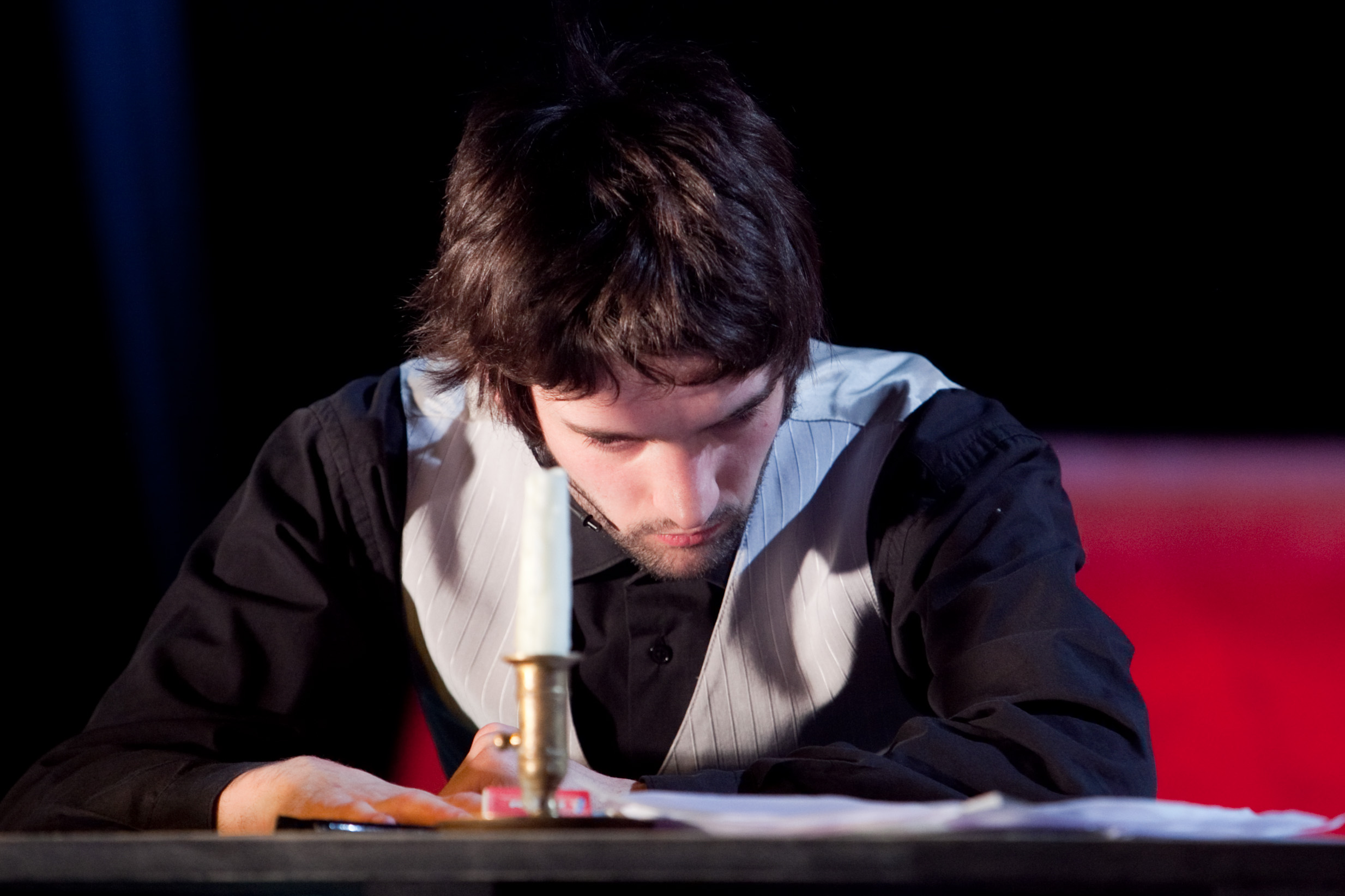 Pēteris Lapiņš Aleksanda Čaka lomā izrādē „Spēlē, Spēlmani!” (2011) // Foto – Ziedonis Safronovs