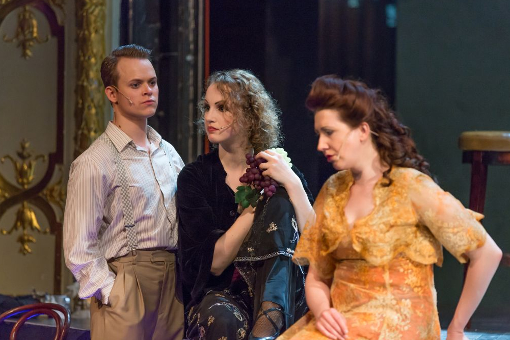 Uldis Siliņš – Klifords Bredšovs, Rūta Dišlere – Sallija Boulsa, Marija Bērziņa – Šneidera jaunkundze Nacionālā teātra mūziklā “Kabarē” (2014) // Foto – Gunārs Janaitis