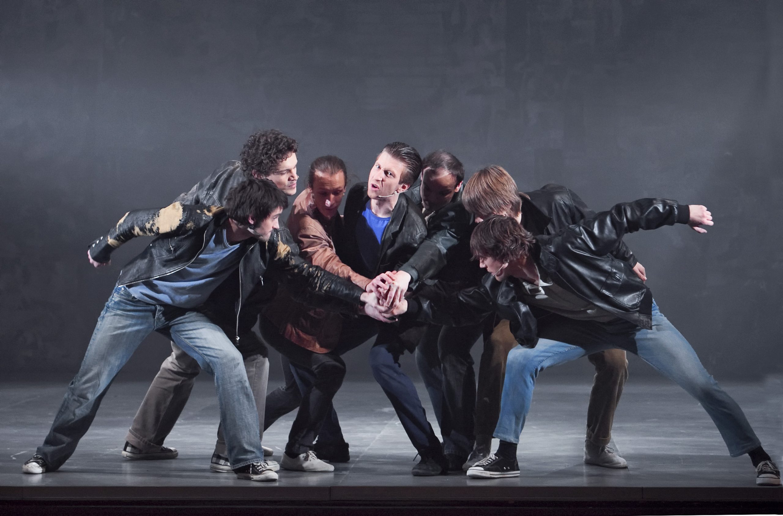 Viktors Ellers (centrā) Rifa lomā izrādē „Vestsaidas stāsts” (2010) // Foto – Ziedonis Safronovs