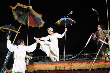 Taču Romeo un Džuljetas līnija – dzidra un psiholoģiski smalki iezīmēta – šajā karnevāliskajā, trokšņainajā šovā bija izcelta kā nezūdoša vērtība. Baltā kleitiņā tērptā Džuljeta (Fernanda Vianna) uz baleta puantēm graciozi izdejoja gan savas lomas liriskos, gan dramatiskos mirkļus. Baltā kostīmā ģērbtais Romeo (Eduardo Moreira), tāpat kā viņa draugi, gan staigāja uz ielu teātra estētikai raksturīgajām koka kājām, taču paspēja gan patiesi iemīlēties Džuljetā, gan debešķīgi skaisti un smeldzīgi dziedāt – arī duetā ar Džuljetu -, gan ar vienu roku uzspēlēt akordeonu. Un nekas no klasiskā mīlas stāsta poētikas, traģiskās nolemtības un smeldzes šajā dīvainajā balto baleta čībiņu un atsprādzējamo koka kāju savienībā /laulībā netika pazaudēts.