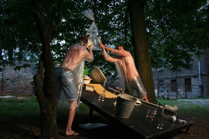 Dramaturga Laura Gundara un scenogrāfes Sintijas Jēkabsones vadībā visas dienas garumā tapa izrādes skice, kuru skatītāji varēja novērtēt tās pašas dienas vakarā. Par galveno detaļu izrādē kļuva slīpa koka virsma, kas bija nedaudz piepacelta no zemes un uz kuras bija pielīmēti dažādi priekšmeti – glāzes, krūzes, tējkanna, tosteris, bļodas u.c. Tieši virs šī slīpā galda bija pakarināts liels maiss, kas bija piepildīts ar ūdeni. Visas lietas, kas bija redzamas izrādē, tika atrastas Līksnas ielas 26 mājā. Ūdens bija vadmotīvs, kas aktierus Armandu Berģi un Artūru Putniņu izrādes gaitā gan satuvināja, gan sanaidoja. Aktieri, kas jau no paša izrādes sākuma bija ģērbti lietusmēteļos, izdūra mazu caurumiņu maisā un tecināja pa to laukā šķidrumu, kuru vēlāk pārlēja dažādos mazākos traukos. Gluži kā bērnībā, spēlējoties pagalmā, bērni laistās ar ūdeni, tā arī šeit aktieri izpaudās no sirds patikas. Aktieri ūdens pārliešanu veica rūpīgi, it kā tas būtu pasaules svarīgākais darbs, un, kas svarīgi, – nerunājot savā starpā, tikai ar dažādu skaņu palīdzību, kuras ļāva nojaust runātāja emocijas. Izrāde vēstīja par uzticēšanos un cilvēku mantkārīgo dabu, kas var izjaukt draudzību, bet ticu, ka katrs skatītājs redzēja ko citu, jo teātra uztvere ir ļoti cieši saistīta ar paša pieredzi. Šī bija viena no jautrākajām un atraktīvākajām izrādes skicēm, jo arī skatītāji dabūja nobaudīt savu tiesu ūdens, kas izšļācās no lielā maisa, kad tas izrādes beigās tika pārplēsts.