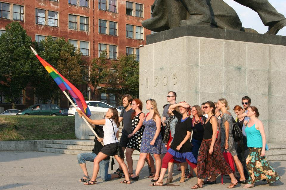 Par performancēm: laimes mirkļus un cerību uz visu mūsu kopīgo nākotni šai pašā mazajā republikā  manī ielēja Valtera Sīļa  2005. gada 23. jūlija performance, kuras laikā dažāda dzimuma skaisti cilvēki stundu turēja varavīksnes krāsas karogu.