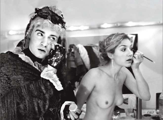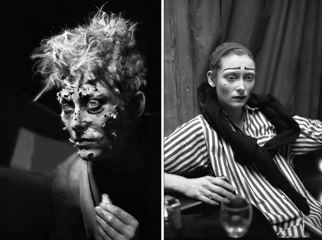 Attēlā pa kreisi – Tilda Svintone izrādē „Cilvēks cilvēkam” („Man to man”), tēlojot sievieti, kura pēc vīra nāves pieņem viņa identitāti. Pa labi – Tilda Svintone Mocarta lomā izrādē “Mocarts un Saljēri”
