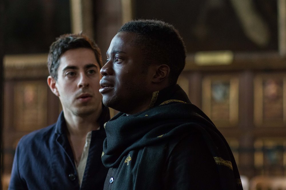 Skats no izrādes “Hamlets”: Horācijs – Metjū Romeins, Hamlets – Ladi Emeruva // Publicitātes foto