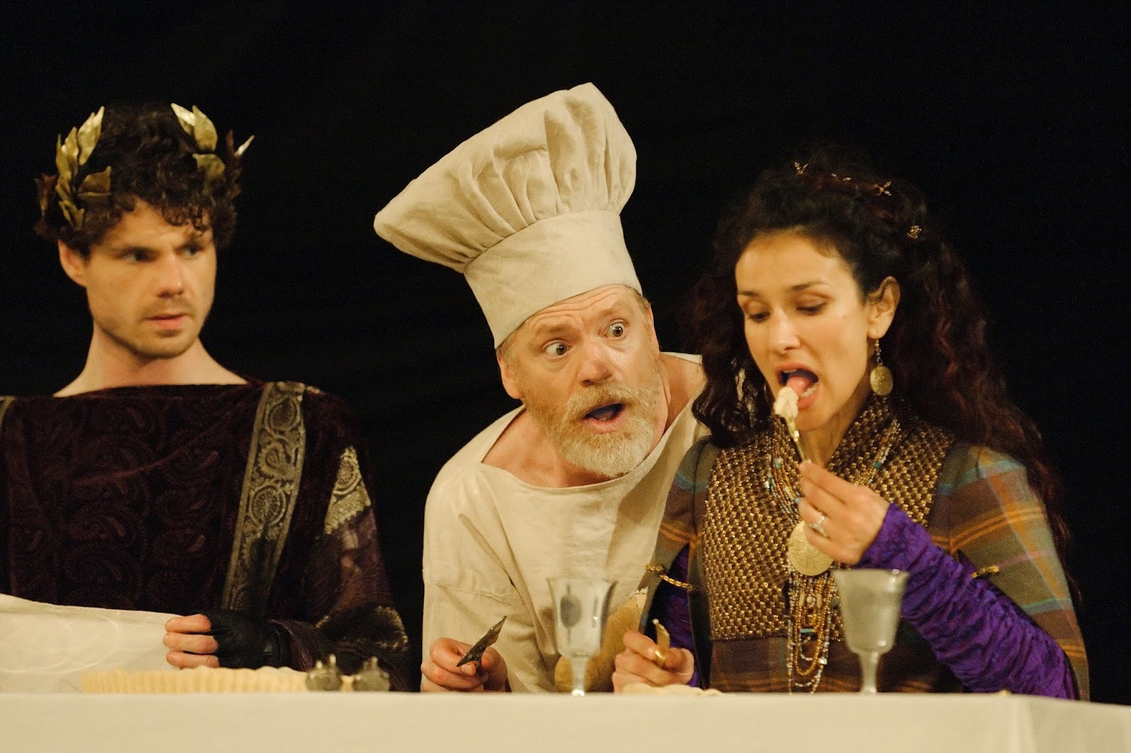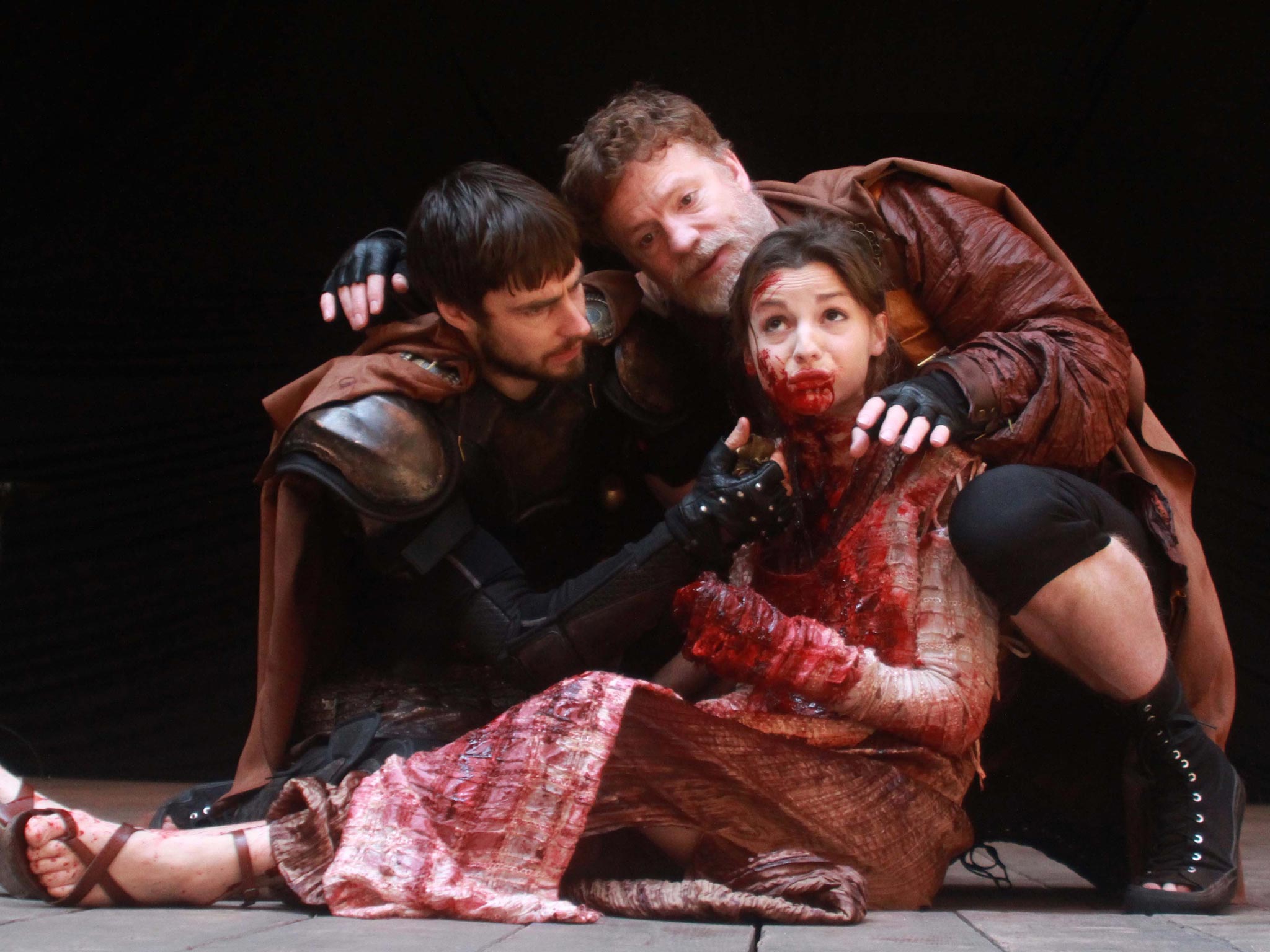 Skats no izrādes „Tits Androniks”: Lūciuss – Difans Dvifors, Lavīnija – Flora Spensere-Langhersta, Tits Androniks – Viljams Haustons // Publicitātes foto